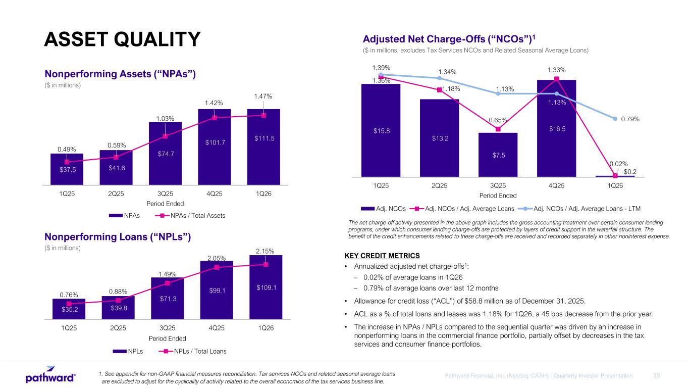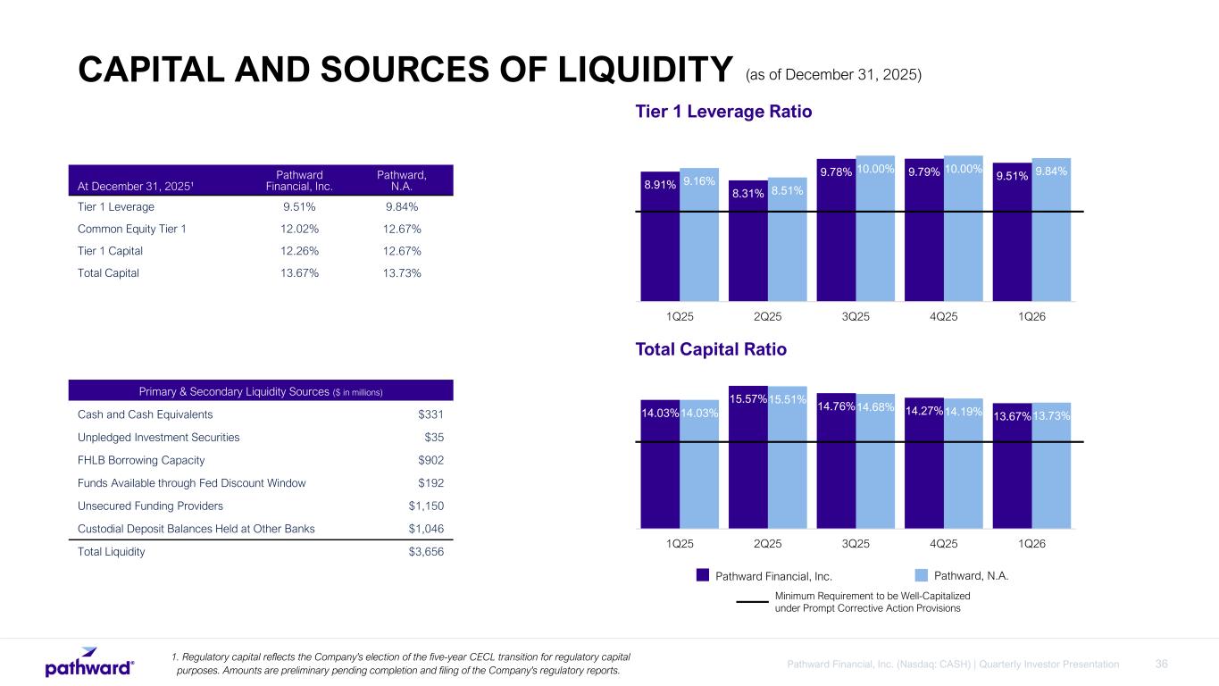 35Pathward Financial, Inc. (Nasdaq: CASH) | Quarterly Investor Presentation $15.8 $13.2 $7.5 $16.5 $0.2 1.36% 1.18% 0.65% 1.33% 0.02% 1.39% 1.34% 1.13% 1.13% 0.79% 1Q25 2Q25 3Q25 4Q25 1Q26 Period Ended Adj. NCOs Adj. NCOs / Adj. Average Loans Adj. NCOs / Adj. Average Loans - LTM Adjusted Net Charge-Offs (“NCOs”)1 ($ in millions, excludes Tax Services NCOs and Related Seasonal Average Loans) KEY CREDIT METRICS • Annualized adjusted net charge-offs1: – 0.02% of average loans in 1Q26 – 0.79% of average loans over last 12 months • Allowance for credit loss (“ACL”) of $58.8 million as of December 31, 2025. • ACL as a % of total loans and leases was 1.18% for 1Q26, a 45 bps decrease from the prior year. • The increase in NPAs / NPLs compared to the sequential quarter was driven by an increase in nonperforming loans in the commercial finance portfolio, partially offset by decreases in the tax services and consumer finance portfolios. 1. See appendix for non-GAAP financial measures reconciliation. Tax services NCOs and related seasonal average loans are excluded to adjust for the cyclicality of activity related to the overall economics of the tax services business line. $35.2 $39.8 $71.3 $99.1 $109.1 0.76% 0.88% 1.49% 2.05% 2.15% 1Q25 2Q25 3Q25 4Q25 1Q26 Period Ended NPLs NPLs / Total Loans Nonperforming Assets (“NPAs”) ($ in millions) Nonperforming Loans (“NPLs”) ($ in millions) $37.5 $41.6 $74.7 $101.7 $111.5 0.49% 0.59% 1.03% 1.42% 1.47% 1Q25 2Q25 3Q25 4Q25 1Q26 Period Ended NPAs NPAs / Total Assets The net charge-off activity presented in the above graph includes the gross accounting treatment over certain consumer lending programs, under which consumer lending charge-offs are protected by layers of credit support in the waterfall structure. The benefit of the credit enhancements related to these charge-offs are received and recorded separately in other noninterest expense. ASSET QUALITY