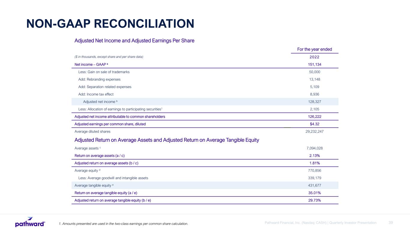 39Pathward Financial, Inc. (Nasdaq: CASH) | Quarterly Investor Presentation NON-GAAP RECONCILIATION 1. Amounts presented are used in the two-class earnings per common share calculation. Adjusted Net Income and Adjusted Earnings Per Share For the year ended ($ in thousands, except share and per share data) 2022 Net income – GAAP a 151,134 Less: Gain on sale of trademarks 50,000 Add: Rebranding expenses 13,148 Add: Separation related expenses 5,109 Add: Income tax effect 8,936 Adjusted net income b 128,327 Less: Allocation of earnings to participating securities1 2,105 Adjusted net income attributable to common shareholders 126,222 Adjusted earnings per common share, diluted $4.32 Average diluted shares 29,232,247 Adjusted Return on Average Assets and Adjusted Return on Average Tangible Equity Average assets c 7,094,028 Return on average assets (a / c) 2.13% Adjusted return on average assets (b / c) 1.81% Average equity d 770,856 Less: Average goodwill and intangible assets 339,179 Average tangible equity e 431,677 Return on average tangible equity (a / e) 35.01% Adjusted return on average tangible equity (b / e) 29.73%
