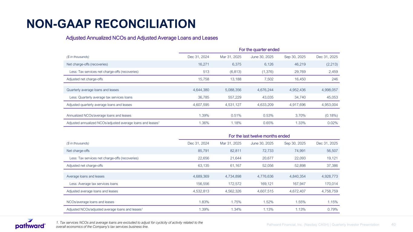 40Pathward Financial, Inc. (Nasdaq: CASH) | Quarterly Investor Presentation NON-GAAP RECONCILIATION For the quarter ended ($ in thousands) Dec 31, 2024 Mar 31, 2025 June 30, 2025 Sep 30, 2025 Dec 31, 2025 Net charge-offs (recoveries) 16,271 6,375 6,126 46,219 (2,213) Less: Tax services net charge-offs (recoveries) 513 (6,813) (1,376) 29,769 2,459 Adjusted net charge-offs 15,758 13,188 7,502 16,450 246 Quarterly average loans and leases 4,644,380 5,088,356 4,676,244 4,952,436 4,998,057 Less: Quarterly average tax services loans 36,785 557,229 43,035 34,740 45,053 Adjusted quarterly average loans and leases 4,607,595 4,531,127 4,633,209 4,917,696 4,953,004 Annualized NCOs/average loans and leases 1.39% 0.51% 0.53% 3.70% (0.18%) Adjusted annualized NCOs/adjusted average loans and leases1 1.36% 1.18% 0.65% 1.33% 0.02% Adjusted Annualized NCOs and Adjusted Average Loans and Leases For the last twelve months ended ($ in thousands) Dec 31, 2024 Mar 31, 2025 June 30, 2025 Sep 30, 2025 Dec 31, 2025 Net charge-offs 85,791 82,811 72,733 74,991 56,507 Less: Tax services net charge-offs (recoveries) 22,656 21,644 20,677 22,093 19,121 Adjusted net charge-offs 63,135 61,167 52,056 52,898 37,386 Average loans and leases 4,689,369 4,734,898 4,776,636 4,840,354 4,928,773 Less: Average tax services loans 156,556 172,572 169,121 167,947 170,014 Adjusted average loans and leases 4,532,813 4,562,326 4,607,515 4,672,407 4,758,759 NCOs/average loans and leases 1.83% 1.75% 1.52% 1.55% 1.15% Adjusted NCOs/adjusted average loans and leases1 1.39% 1.34% 1.13% 1.13% 0.79% 1. Tax services NCOs and average loans are excluded to adjust for cyclicity of activity related to the overall economics of the Company’s tax services business line.