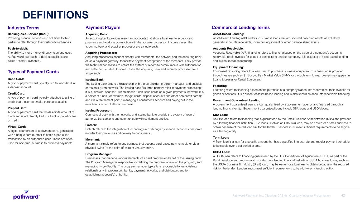 42Pathward Financial, Inc. (Nasdaq: CASH) | Quarterly Investor Presentation Industry Terms Types of Payment Cards Banking-as-a-Service (BaaS): Providing financial services and solutions to third parties to offer through their distribution channels. Push-to-debit: The ability to move money directly to an end user. At Pathward, our push-to-debit capabilities are called “Faster Payments”. Debit Card: A type of payment card typically tied to funds held in a deposit account. Credit Card: A type of payment card typically attached to a line of credit that a user can make purchases against. Prepaid Card: A type of payment card that holds a finite amount of funds and is not directly tied to a bank account or line of credit. Virtual Card: A digital counterpart to a payment card, generated with a unique card number to settle a particular transaction by an authorized user. These are often used for one-time, business-to-business payments. Payment Players Acquiring Bank: An acquiring bank provides merchant accounts that allow a business to accept card payments and works in conjunction with the acquirer processor. In some cases, the acquiring bank and acquirer processor are a single entity. Acquiring Processors: Acquiring processors connect directly with merchants, the network and the acquiring bank, or via a payment gateway, to facilitate payment acceptance at the merchant. They provide the technical capabilities to create the system of record to communicate with authorization and settlement entities. In some cases, the acquiring bank and acquirer processor are a single entity. Issuing Bank: The issuing bank enters a relationship with the cardholder, program manager, and enables cards on a given network. The issuing bank fills three primary roles in payment processing: it is a “network sponsor,” which means it can issue cards on a given payments network; it is a holder of funds (for example, for gift cards, deposit accounts and other non-credit cards); and it is a “settlement point,” managing a consumer’s account and paying out to the merchant’s account after a purchase. Issuing Processor: Connects directly with the networks and issuing bank to provide the system of record, authorize transactions and communicate with settlement entities. Fintech: Fintech refers to the integration of technology into offerings by financial services companies in order to improve use and delivery to consumers. Merchant: A merchant simply refers to any business that accepts card-based payments either via a physical swipe (at the point-of-sale) or virtually online. Program Manager: Businesses that manage various elements of a card program on behalf of the issuing bank. The Program Manager is responsible for defining the program, operating the program, and managing its profitability. The program manager typically is responsible for establishing relationships with processors, banks, payment networks, and distributors and for establishing account(s) at banks. DEFINITIONS Commercial Lending Terms Asset-Based Lending: Asset-Based Lending (ABL) refers to business loans that are secured based on assets as collateral, generally accounts receivable, inventory, equipment or other balance sheet assets. Accounts Receivable: Accounts Receivable (A/R) financing refers to financing based on the value of a company’s accounts receivable (their invoices for goods or services) to another company. It is a subset of asset-based lending and is also known as factoring. Equipment Financing: Equipment Financing refers to a loan used to purchase business equipment. The financing is provided through leases such as $1 Buyout, Fair Market Value (FMV), or through term loans. Leases may appear in Loans & Leases or Rental Equipment. Factoring: Factoring refers to financing based on the purchase of a company’s accounts receivables, their invoices for goods or services. It is a subset of asset-based lending and is also known as accounts receivable financing. Government Guaranteed Lending: A government guaranteed loan is a loan guaranteed by a government agency and financed through a lending financial entity. Government guaranteed loans include SBA loans and USDA loans. SBA Loan: An SBA loan refers to financing that is guaranteed by the Small Business Administration (SBA) and provided by a lending financial institution. SBA loans, such as an SBA 7(a) loan, may be easier for a small business to obtain because of the reduced risk for the lender. Lenders must meet sufficient requirements to be eligible as a lending entity. Term Loan: A Term loan is a loan for a specific amount that has a specified interest rate and regular payment schedule to be repaid over a set period of time. USDA Loan: A USDA loan refers to financing guaranteed by the U.S. Department of Agriculture (USDA) as part of the Rural Development program and provided by a lending financial institution. USDA business loans, such as the USDA Business & Industry (B & I) loan, may be easier for a business to obtain because of the reduced risk for the lender. Lenders must meet sufficient requirements to be eligible as a lending entity.