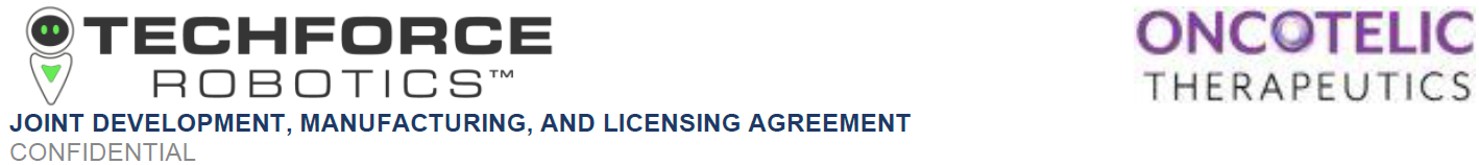 THIS JOINT DEVELOPMENT, MANUFACTURING, AND LICENSING AGREEMENT (this “Agreement”) is entered into as of March 31, 2026 (the “Effective Date”), by and between ONCOTELIC THERAPEUTICS, INC., a corporation duly organized and validly existing under the laws of the State of Delaware, with its principal place of business at 29397 Agoura Road, Suite 107 Agoura Hills, CA 91301, California (hereinafter, “Oncotelic”), on the one hand, and TECHFORCE ROBOTICS, INC., a corporation duly organized and validly existing under the laws of the State of Nevada, with its principal place of business at 42225 Remington Ave. #A15, Temecula, CA 92590 (hereinafter, “TechForce”), on the other hand. Oncotelic and TechForce are each referred to herein individually as a “Party” and collectively as the “Parties.”