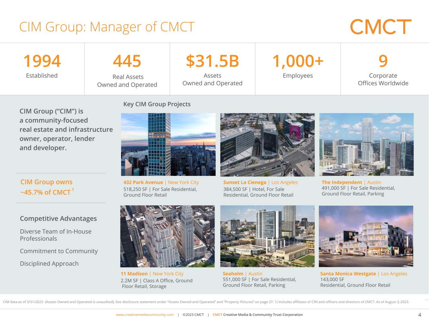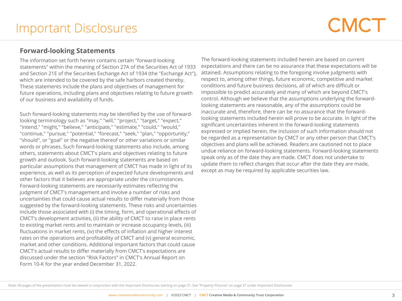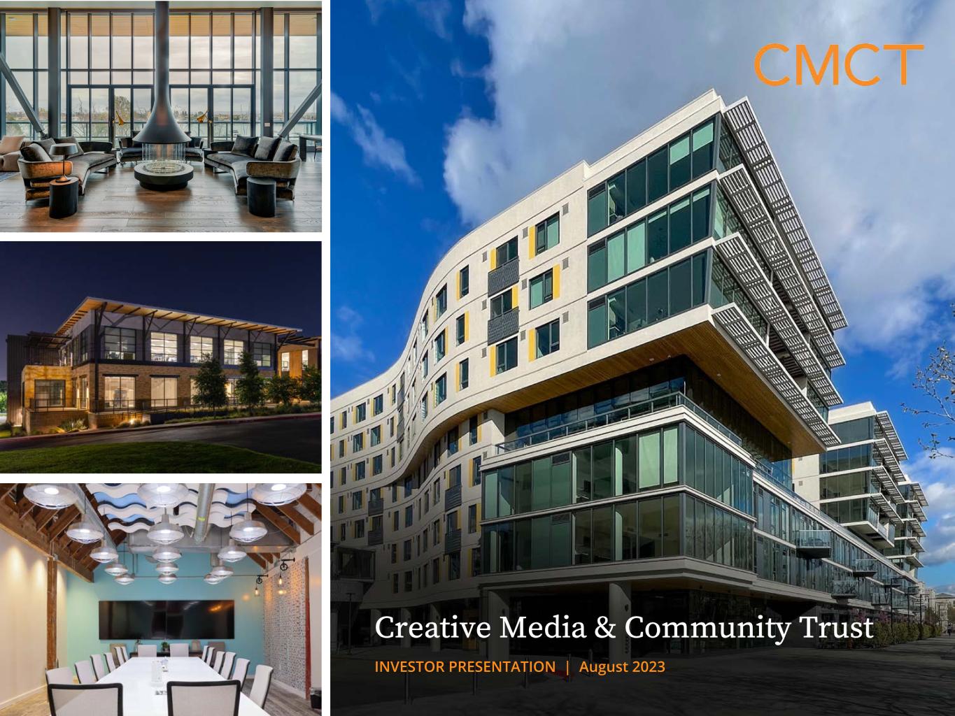 www.cimgroup.com | ©2018 CIM Group | TRADE SECRET / CONFIDENTIAL INFORMATIONwww.creativemediacommunity.com | ©2023 CMCT | CMCT Creative Media & Community Trust Corporation 2 Note: All pages of the presentation must be viewed in conjunction with the Important Disclosures starting on page 37. See “Property Pictures” on page 37 under Important Disclosures. Important Disclosures Free Writing Prospectus | Creative Media & Community Trust Corporation Filed Pursuant to Rule 433 | Dated August 10, 2023 | Registration Statement No. 333-268032 Creative Media & Community Trust Corporation (formerly known as CIM Commercial Trust Corporation) (“CMCT”) has filed a registration statement (including a base prospectus) with the Securities and Exchange Commission (the “SEC”) in respect of the offering to which this communication relates. Before you participate in CMCT's offering of Series A1 Preferred Stock, you should read the prospectus supplement, dated November 23, 2022, and the accompanying base prospectus, dated November 22, 2022 (please note that CMCT's offerings of Series A Preferred Stock and Series D Preferred Stock have been terminated). Before making any investment in such offering, you should read the other documents CMCT has filed with the SEC for more complete information about CMCT and such offering. You may obtain these documents for free by visiting EDGAR on the SEC web site at www.sec.gov. You may request to receive a prospectus in respect of either of the foregoing offerings by calling toll-free at 1-866-341-2653.