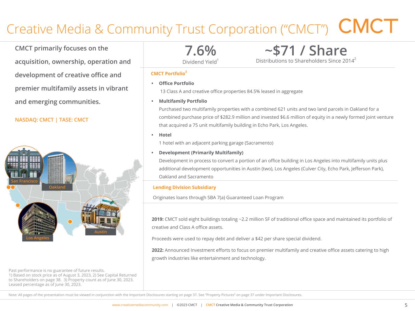 www.cimgroup.com | ©2018 CIM Group | TRADE SECRET / CONFIDENTIAL INFORMATIONwww.creativemediacommunity.com | ©2023 CMCT | CMCT Creative Media & Community Trust Corporation 4 Note: All pages of the presentation must be viewed in conjunction with the Important Disclosures starting on page 37. See “Property Pictures” on page 37 under Important Disclosures. CIM Group: Manager of CMCT CIM data as of 3/31/2023 (Assets Owned and Operated is unaudited). See disclosure statement under “Assets Owned and Operated” and “Property Pictures” on page 37. 1) Includes affiliates of CIM and officers and directors of CMCT. As of August 3, 2023. CIM Group (“CIM”) is a community-focused real estate and infrastructure owner, operator, lender and developer. The Independent | Austin 491,000 SF | For Sale Residential, Ground Floor Retail, Parking Key CIM Group Projects Santa Monica Westgate | Los Angeles 143,000 SF Residential, Ground Floor Retail Sunset La Cienega | Los Angeles 384,500 SF | Hotel, For Sale Residential, Ground Floor Retail Seaholm | Austin 551,000 SF | For Sale Residential, Ground Floor Retail, Parking 432 Park Avenue | New York City 518,250 SF | For Sale Residential, Ground Floor Retail 11 Madison | New York City 2.2M SF | Class A Office, Ground Floor Retail, Storage 1994 Established 445 Real Assets Owned and Operated $31.5B Assets Owned and Operated 1,000+ Employees 9 Corporate Offices Worldwide CIM Group owns ~45.7% of CMCT 1 Competitive Advantages Diverse Team of In-House Professionals Commitment to Community Disciplined Approach