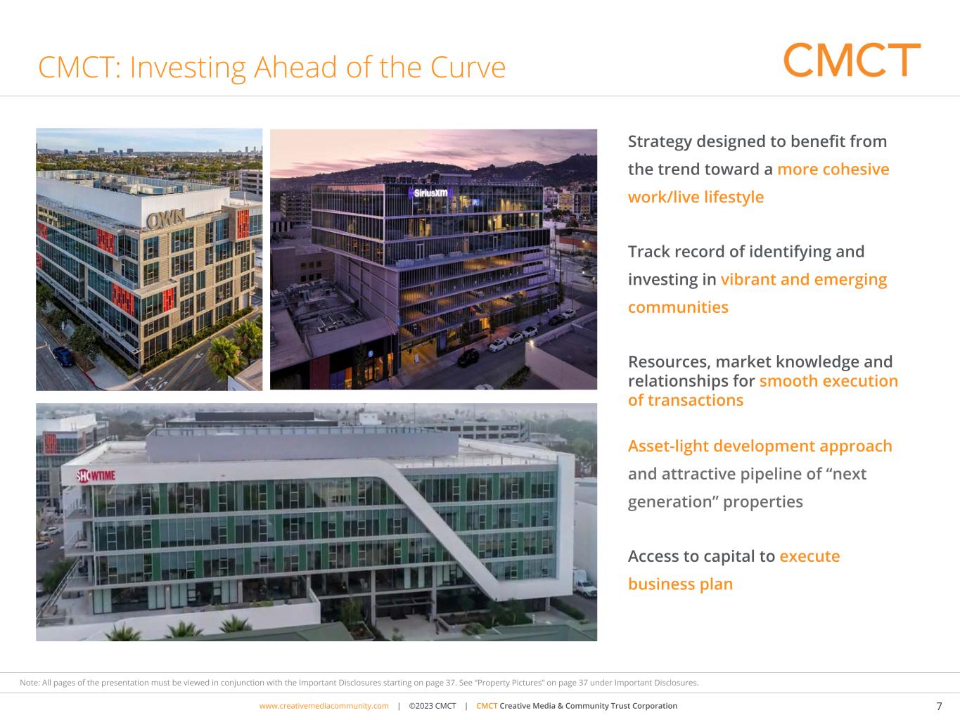 www.cimgroup.com | ©2018 CIM Group | TRADE SECRET / CONFIDENTIAL INFORMATIONwww.creativemediacommunity.com | ©2023 CMCT | CMCT Creative Media & Community Trust Corporation 36 Note: All pages of the presentation must be viewed in conjunction with the Important Disclosures starting on page 37. See “Property Pictures” on page 37 under Important Disclosures. Important Information - Debt and Preferred Summary 1. Excludes: (a) $5.3 million of secured borrowings – government guaranteed loans, which represent sold loans that are treated as secured borrowing because the loan sales did not meet the derecognition criteria provided for in ASC 860-30, Secured Borrowing and Collateral, and (b) premiums, discounts and debt issuance costs. 2. The Company’s variable rate mortgages payable are secured by a deed of trust on the respective properties and assignments of rents receivable. As of June 30, 2023, the Company’s variable rate mortgages payable had a variable interest rates ranging from SOFR plus 3.25% - 3.35%, with monthly payments of interest only, due on various dates from June 7, 2024 to July 7, 2025 with extension options subject to certain conditions being met. The loans are nonrecourse. 3. On March 9, 2023, the Company completed a securitization of the unguaranteed portion of certain of its SBA 7(a) loans receivable with the issuance of $54.1 million of unguaranteed SBA 7(a) loan-backed notes (with net proceeds of approximately $43.3 million, after payment of fees and expenses in connection with the securitization and the funding of a reserve account and an escrow account). The SBA 7(a) loan-backed notes are collateralized by the right to receive payments and other recoveries attributable to the unguaranteed portions of certain of our SBA 7(a) loans receivable. The SBA 7(a) loan-backed notes mature on March 20, 2048, with monthly payments due as payments on the collateralized loans are received. 4. In December 2022, the Company refinanced its 2018 credit facility and replaced it with a new 2022 credit facility, entered into with a bank syndicate, that includes a $56.2 million term loan (the “2022 Credit Facility Term Loan”) as well as a revolver allowing the Company to borrow up to $150.0 million (the “2022 Credit Facility Revolver”), both of which are collectively subject to a borrowing base calculation. The 2022 credit facility is secured by properties in the Company’s real estate portfolio: six office properties and one hotel property (as well as the hotel’s adjacent parking garage and retail property). The 2022 credit facility bears interest at (A) the base rate plus 1.50% or (B) SOFR plus 2.60%. As of June 30, 2023, the variable interest rate was 7.69%. The 2022 Credit Facility Revolver is also subject to an unused commitment fee of 0.15% or 0.25% depending on the amount of aggregate unused commitments. The 2022 credit facility is guaranteed by the Company and the Company is subject to certain financial maintenance covenants. The 2022 credit facility matures in December 2025 and provides for two one-year extension options under certain conditions, including providing notice of the election and paying an extension fee of 0.15% of each lender’s commitment being extended on the effective date of such extension. 5. Outstanding Series A1 Preferred Stock represents total shares issued as of June 30, 2023 of 8,194,099, less redemptions of 34,000 shares, multiplied by the stated value of $25.00 per share. Includes shares issued to CIM Group in lieu of cash payment of the asset management fee. Gross proceeds are not net of commissions, fees, allocated costs or discount. Dividends on Series A1 Preferred Stock are paid at a rate of the greater of (i) an annual rate of 6.0% (i.e., the equivalent of $0.3750 per share per quarter) and (ii) the Federal Funds (Effective) Rate for such quarter and plus 2.5% up to a maximum of 2.5% of the Series A1 Preferred Stock Stated Value per quarter. 6. Outstanding Series A Preferred Stock represents total shares issued as of June 30, 2023 of 8,820,338, less redemptions of 938,380 shares, multiplied by the stated value of $25.00 per share. Includes shares issued to CIM Group in lieu of cash payment of the asset management fee. Gross proceeds are not net of commissions, fees, allocated costs or discount. 7. Outstanding Series D Preferred Stock represents total shares issued as of June 30, 2023 of 56,857, less redemptions of 8,410, multiplied by the stated value of $25.00 per share. Gross proceeds are not net of commissions, fees, allocated costs or discount.