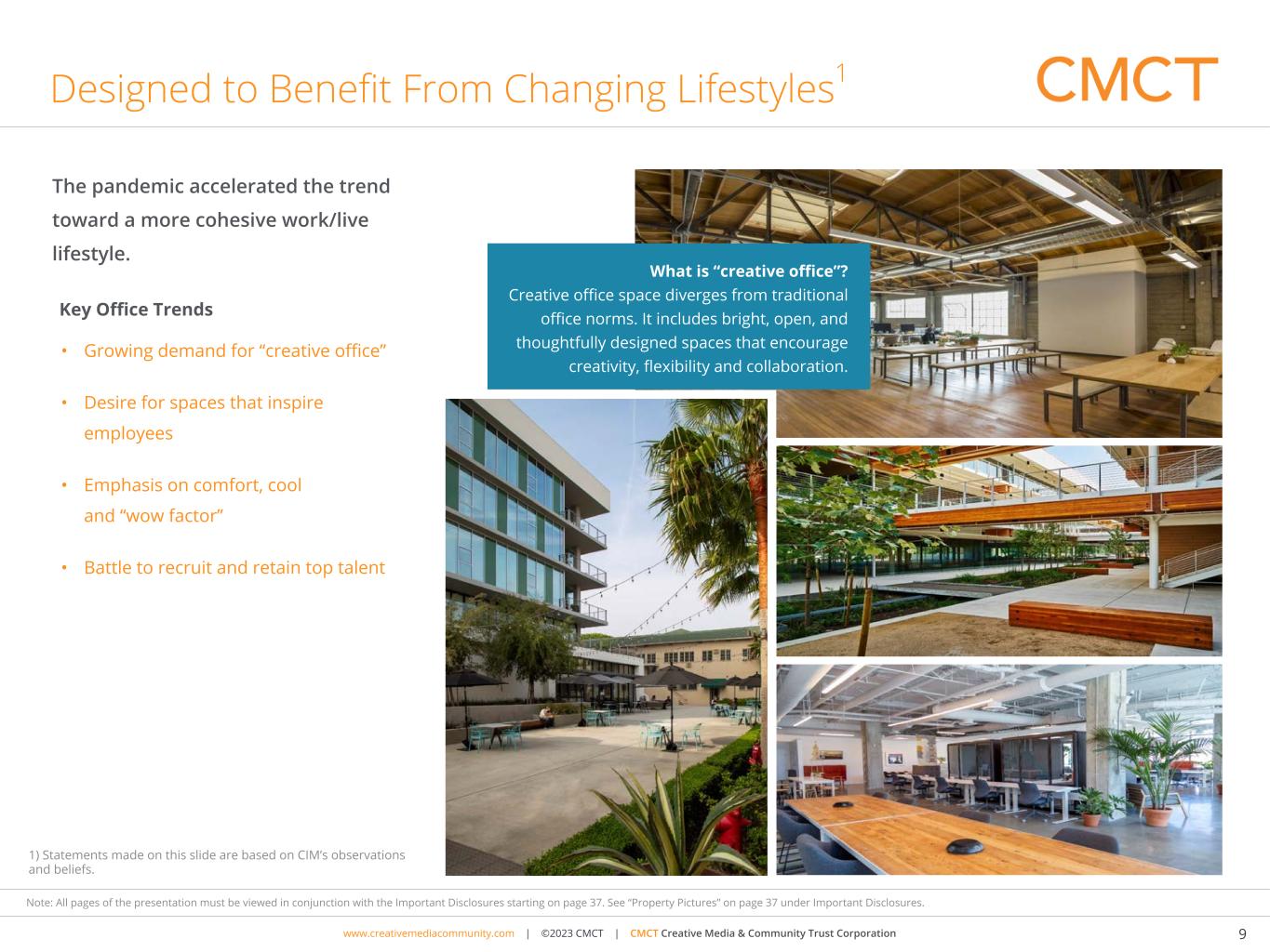 www.cimgroup.com | ©2018 CIM Group | TRADE SECRET / CONFIDENTIAL INFORMATIONwww.creativemediacommunity.com | ©2023 CMCT | CMCT Creative Media & Community Trust Corporation 8 Note: All pages of the presentation must be viewed in conjunction with the Important Disclosures starting on page 37. See “Property Pictures” on page 37 under Important Disclosures. Designed to Benefit From Changing Lifestyles1 Key Multifamily Trends Walkability Luxury Amenities Well-Connected Hybrid Work Lifestyle Culture-Oriented Locations Vibrant Neighborhoods in Major U.S. Markets 1. Statements made on this slide are based on CIM’s observations and beliefs. First Quarter 2023 Acquisitions Channel House Jack London Square, Oakland Parkview Living Echo Park, Los Angeles Eleven Fifty Clay Oakland Eleven Fifty Clay