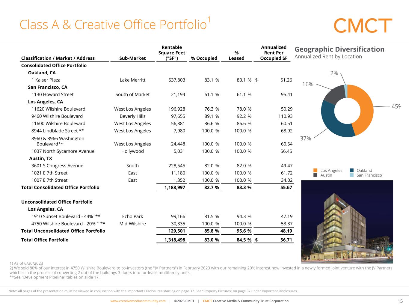 www.cimgroup.com | ©2018 CIM Group | TRADE SECRET / CONFIDENTIAL INFORMATIONwww.creativemediacommunity.com | ©2023 CMCT | CMCT Creative Media & Community Trust Corporation 14 Note: All pages of the presentation must be viewed in conjunction with the Important Disclosures starting on page 37. See “Property Pictures” on page 37 under Important Disclosures. Resources, Market-Knowledge and Relationships1 CMCT caters to tenants in rapidly growing tech and entertainment industries. CMCT's Notable Tenants CIM Relationships 1. See disclosure statement under “Logos” on page 37.