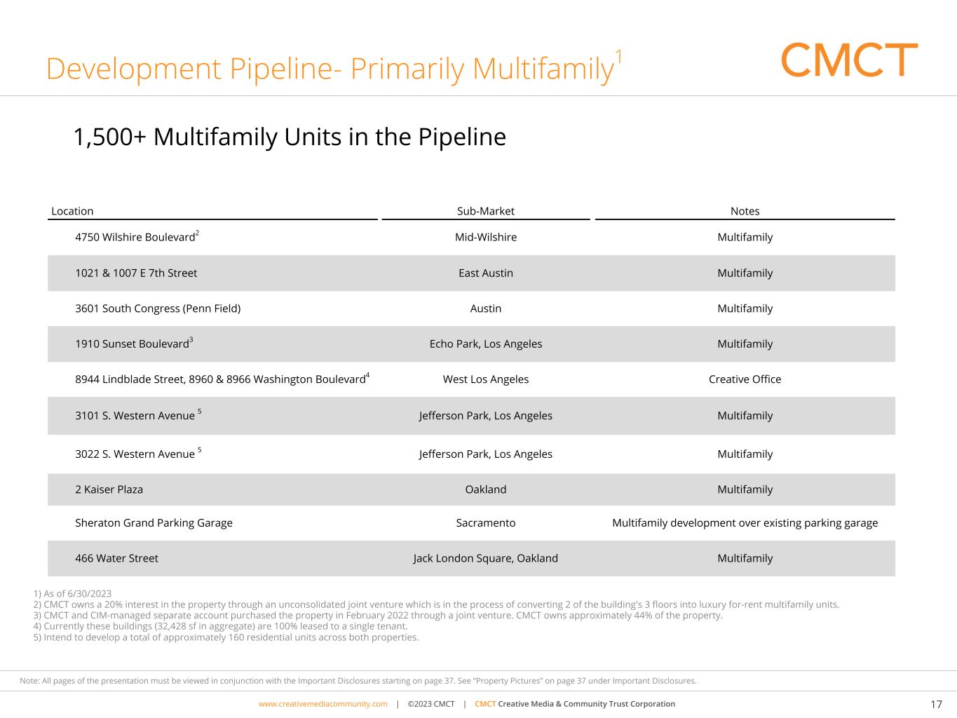 www.cimgroup.com | ©2018 CIM Group | TRADE SECRET / CONFIDENTIAL INFORMATIONwww.creativemediacommunity.com | ©2023 CMCT | CMCT Creative Media & Community Trust Corporation 16 Note: All pages of the presentation must be viewed in conjunction with the Important Disclosures starting on page 37. See “Property Pictures” on page 37 under Important Disclosures. Premier Multifamily and Hotel Multifamily Portfiolio Classification / Market / Property Sub-Market Units % Occupied Annualized Rent (in thousands)1 Monthly Rent Per Occupied Unit2 Consolidated Office Portfolio Oakland, CA Channel House Jack London Distict 333 81.4 % $ 10,879 $ 3,345 1150 Clay Downtown 288 86.5 % 8,209 2,747 Total Consolidated Multifamily Portfolio 621 83.8 % $ 19,088 $ 3,059 Unconsolidated Multifamily Portfolio Los Angeles, CA 1902 Park Avenue - 50% Echo Park 75 85.3 % $ 1,334 $ 1,737 Total Unconsolidated Multifamily Portfolio 75 85.3 % $ 1,334 $ 1,737 Total Multifamily Portfolio 696 83.9 % $ 20,422 $ 2,914 Hotel & Parking Garage Location / Property Sub-Market % Occupied 3 RevPAR Sacramento, CA Sheraton Grand Hotel Downtown/Midtown 80.9 % $ 163.18 Sheraton Grand Hotel Parking Garage & Retail Downtown/Midtown 81.0 % NA 1) Represents gross monthly base rent under leases commenced as of June 30, 2023, multiplied by twelve. This amount reflects total cash rent before concessions. 2) Represents gross monthly base rent under leases commenced as of June 30, 2023, divided by occupied units. This amount reflects total cash rent before concessions. 3) Represents trailing six-month occupancy as of June 30, 2023, calculated as the number of occupied rooms divided by the number of available rooms.
