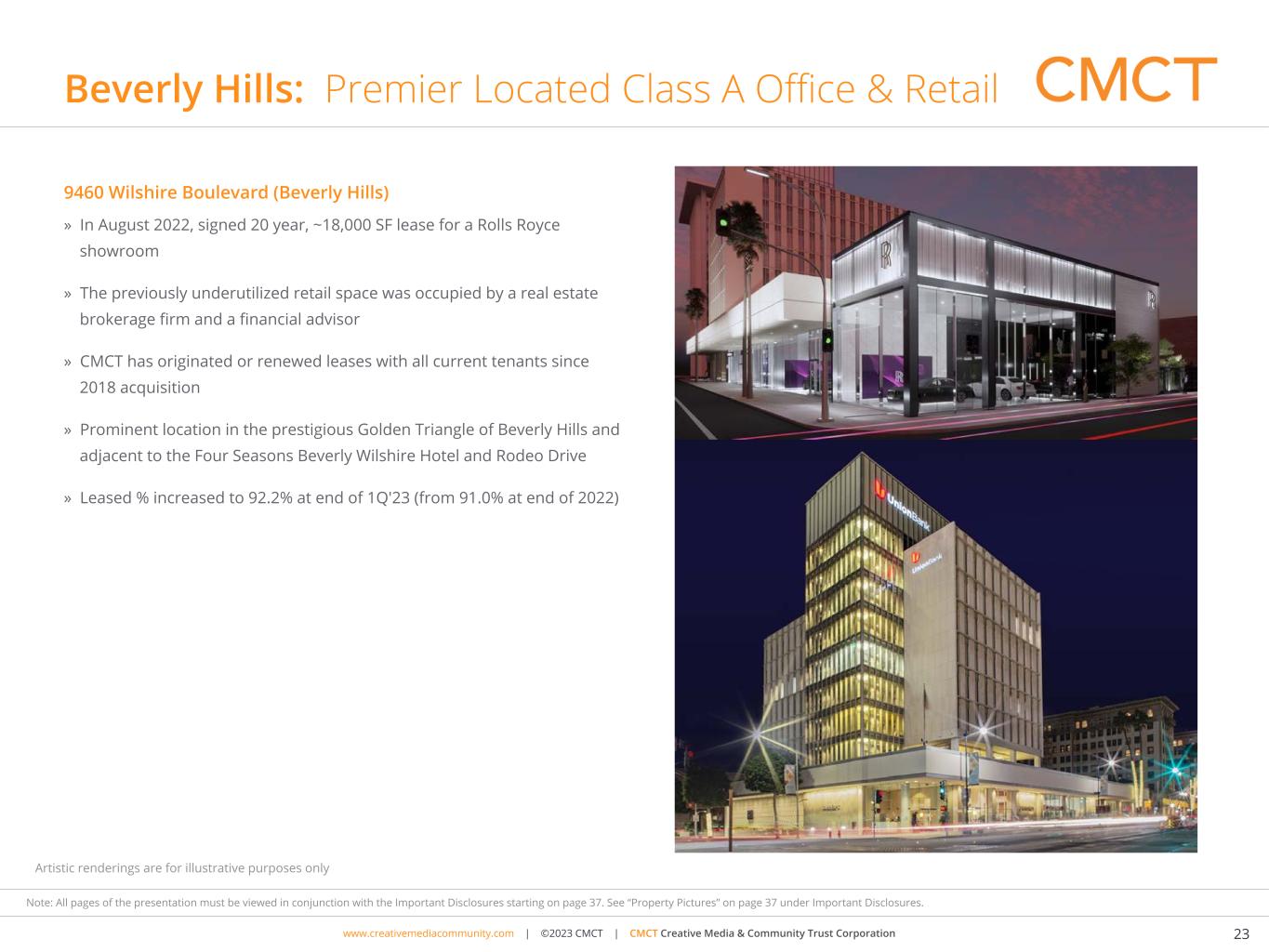 www.cimgroup.com | ©2018 CIM Group | TRADE SECRET / CONFIDENTIAL INFORMATIONwww.creativemediacommunity.com | ©2023 CMCT | CMCT Creative Media & Community Trust Corporation 22 Note: All pages of the presentation must be viewed in conjunction with the Important Disclosures starting on page 37. See “Property Pictures” on page 37 under Important Disclosures. Los Angeles: Multifamily 4750 Wilshire Boulevard (Park Mile) » Converting unleased space to multifamily » Closed coinvestment in 1Q'23 whereby CMCT to earn a management fee and potentially a promote; CMCT's ownership declined to 20% » Started renovation in March 2023 » Centrally located in affluent Park Mile/Hancock Park surrounded by multi million dollar single family homes » Short drive time to Hollywood/West Hollywood (10 minutes), Beverly Hills/Culver City/Downtown LA (20 minutes) and Santa Monica (30 minutes) 1902 Park Avenue (Echo Park) » Acquired in 1Q'23 for $19.1 million, or $255,000 per unit (50% joint venture) on an off-market basis » Newer vintage asset that opened in 2011 » Echo Park is an emerging trendy submarket northwest of downtown LA; walkable area with dozens of dining and entertainment options » Recent new leases executed at a significant premium to in-place rents » 1 BR- $2,100-$2,250 (versus average in place of $1,655) » 2 BR - $2,700-$2,750 (versus average in place of $2,223) Artistic rendering is for illustrative purposes only.