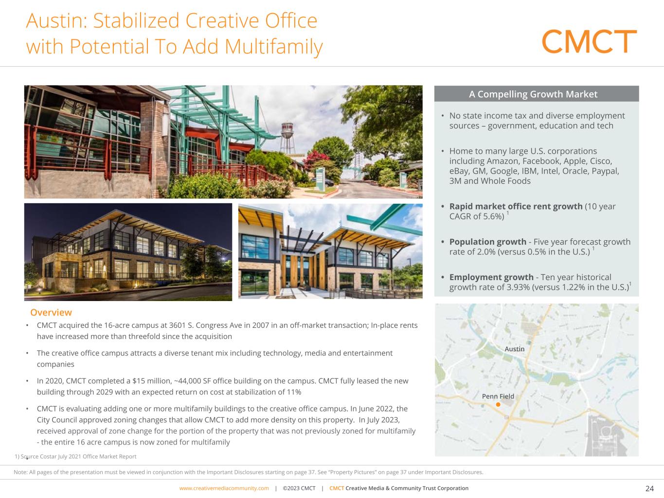 www.cimgroup.com | ©2018 CIM Group | TRADE SECRET / CONFIDENTIAL INFORMATIONwww.creativemediacommunity.com | ©2023 CMCT | CMCT Creative Media & Community Trust Corporation 24 Note: All pages of the presentation must be viewed in conjunction with the Important Disclosures starting on page 37. See “Property Pictures” on page 37 under Important Disclosures. Austin: Stabilized Creative Office with Potential To Add Multifamily • CMCT acquired the 16-acre campus at 3601 S. Congress Ave in 2007 in an off-market transaction; In-place rents have increased more than threefold since the acquisition • The creative office campus attracts a diverse tenant mix including technology, media and entertainment companies • In 2020, CMCT completed a $15 million, ~44,000 SF office building on the campus. CMCT fully leased the new building through 2029 with an expected return on cost at stabilization of 11% • CMCT is evaluating adding one or more multifamily buildings to the creative office campus. In June 2022, the City Council approved zoning changes that allow CMCT to add more density on this property. In July 2023, received approval of zone change for the portion of the property that was not previously zoned for multifamily - the entire 16 acre campus is now zoned for multifamily • • No state income tax and diverse employment sources – government, education and tech • Home to many large U.S. corporations including Amazon, Facebook, Apple, Cisco, eBay, GM, Google, IBM, Intel, Oracle, Paypal, 3M and Whole Foods • Rapid market office rent growth (10 year CAGR of 5.6%) 1 • Population growth - Five year forecast growth rate of 2.0% (versus 0.5% in the U.S.) 1 • Employment growth - Ten year historical growth rate of 3.93% (versus 1.22% in the U.S.)1 A Compelling Growth Market Austin Overview Penn Field Penn Field Austin 1) Source Costar July 2021 Office Market Report