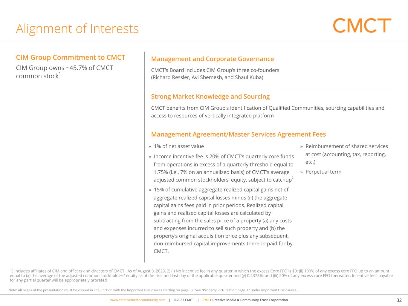 www.cimgroup.com | ©2018 CIM Group | TRADE SECRET / CONFIDENTIAL INFORMATIONwww.creativemediacommunity.com | ©2023 CMCT | CMCT Creative Media & Community Trust Corporation 31 Note: All pages of the presentation must be viewed in conjunction with the Important Disclosures starting on page 37. See “Property Pictures” on page 37 under Important Disclosures. CIM Group: Commitment to ESG CIM is committed to incorporating Environmental, Social and Governance (ESG) criteria into its business strategies and day-to- day operations while supporting its tenants, employees and communities in these initiatives.1 Sustainable & Environmental Initiatives » For more than 25 years, CIM has developed and operated sustainable infrastructure needed to support growing communities. Key projects include renewable energy, water storage and waste- to-value initiatives. » CIM is a member of the Principles for Responsible Investment (PRI), a GRESB assessment participant and a partner in the EPA’s Energy Star® program, with several LEED certified buildings. Additionally, CIM uses Energy Star® consumption tracking at more than 100 properties. » CIM’s water storage solution improves water supply sustainability, while its waste-to-value solution produces an alternative to petroleum-based products, cuts carbon emission and frees up landfills. ESG Committee » Comprised of leaders from across the organization, CIM’s ESG committee supports and elevates CIM’s sustainability efforts. The committee authored CIM’s formal ESG policy, which details the organization’s continued commitment to incorporate ESG best practices into each new project and ongoing. CIMpact » CIMpact coordinates grassroots initiatives and partners with regional and national non-profit organizations to further CIM’s positive impact in communities. » Through CIMpact, we support and encourage corporate and employee-led voluntary community service activities on both local and national levels. Diversity, Equity & Inclusion Council » Through employee education and reporting, as well as community outreach, the Diversity & Inclusion Council plays a crucial role in CIM’s effort to encourage employees to honor and celebrate diversity in relationships with each other and all those we serve. 1) While CIM may consider ESG factors when making an investment decision, the Fund does not pursue an ESG-based investment strategy or limit its investments to those that meet specific ESG criteria or standards. Any reference herein to environmental or social considerations is not intended to qualify our duty to maximize risk-adjusted returns.