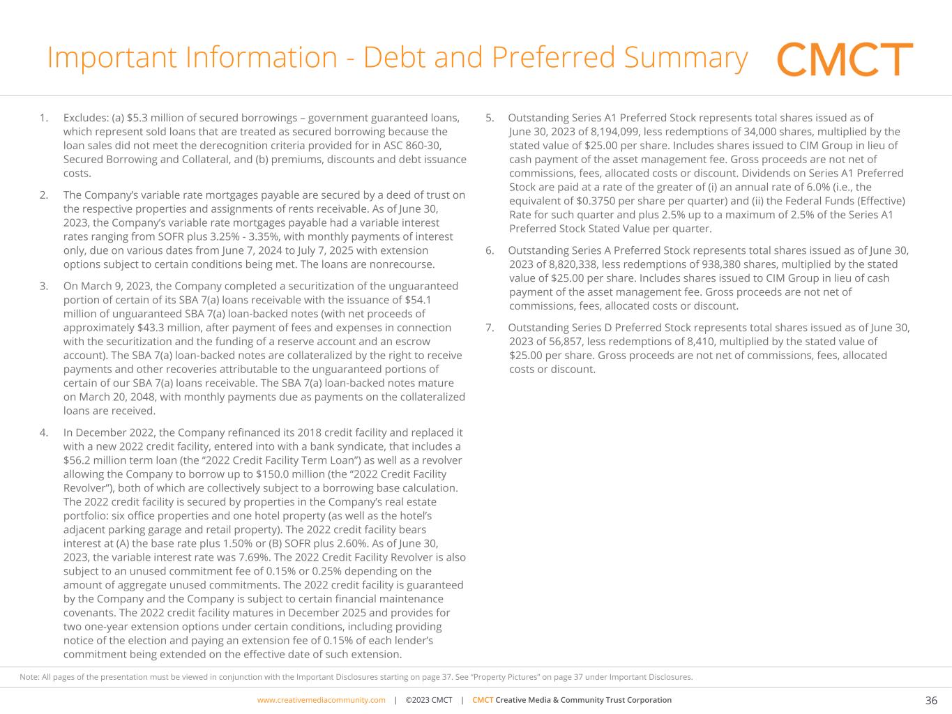 www.cimgroup.com | ©2018 CIM Group | TRADE SECRET / CONFIDENTIAL INFORMATIONwww.creativemediacommunity.com | ©2023 CMCT | CMCT Creative Media & Community Trust Corporation 35 Note: All pages of the presentation must be viewed in conjunction with the Important Disclosures starting on page 37. See “Property Pictures” on page 37 under Important Disclosures. $3.9 $87.3 $243.0 $104.1 $6.4 $42.3 2023 2024 2025 2026 2027 Thereafter Debt & Preferred Summary (June 30, 2023)1 Fixed 20% Floating * 80% Debt Maturity Schedule (June 30, 2023)1 | in millions Fixed Debt vs. Floating Debt (June 30, 2023)1 Mortgage Payable Interest structure (fixed/variable etc.) Interest Rate Maturity/ Expiration Date Loan balance (in millions) Fixed rate mortgage payable Fixed 4.14% 7/1/2026 $ 97.1 Variable rate mortgages payable2 Variable SOFR + 3.25% - SOFR +3.35% 6/7/2024 - 7/7/2025 $ 165.7 Total Mortgage Payable $ 262.8 Other Debt SBA 7(a) Loan-Backed Notes 3 Variable SOFR + 2.90% 3/20/2043 $ 49.0 Total Other Debt $ 49.0 Corporate Debt 2022 Revolving Credit Facility 4 Variable SOFR + 2.60% 12/14/2025 $ 148.2 Junior Subordinated Notes Variable LIBOR + 3.25% 3/30/2035 $ 27.1 Total Corporate Debt $ 175.3 Total Debt $ 487.1 Preferred Stock Interest structure (fixed/variable etc.) Coupon Maturity/ Expiration Date Outstanding (in millions) Series A1 Variable4 7.08% N/A $ 204.0 5 Series A Fixed 5.50% N/A 197.0 6 Series D Fixed 5.65% N/A 1.2 7 Total Preferred Stock $ 402.3 Total Debt + Preferred Stock $ 889.4 Capital Structure Designed to Enhance Returns and Mitigate Risk See "Important Information - Debt and Preferred Summary" on slide 36. *39% of floating rate debt is subject to interest rate caps