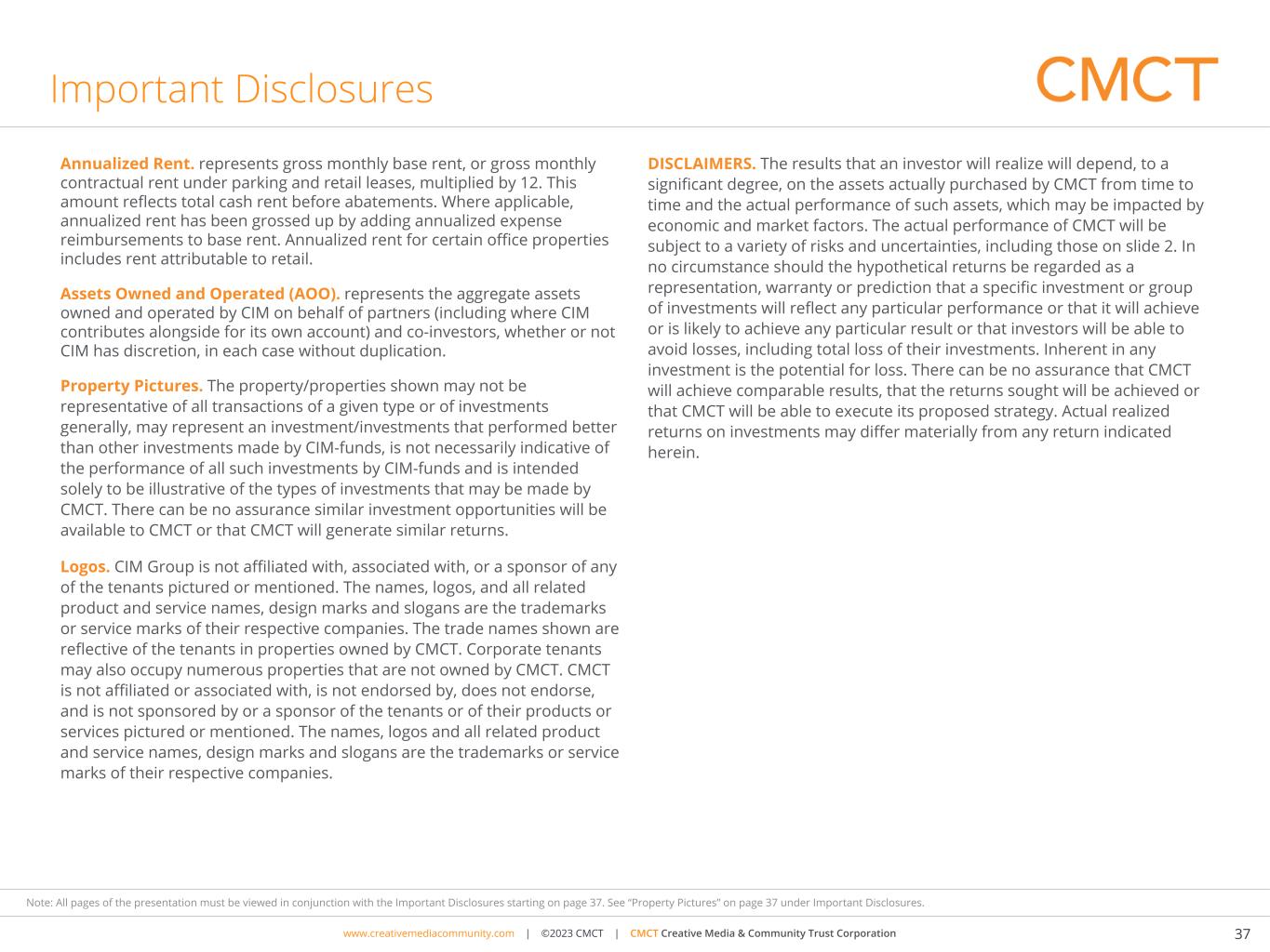 www.cimgroup.com | ©2018 CIM Group | TRADE SECRET / CONFIDENTIAL INFORMATIONwww.creativemediacommunity.com | ©2023 CMCT | CMCT Creative Media & Community Trust Corporation 37 Note: All pages of the presentation must be viewed in conjunction with the Important Disclosures starting on page 37. See “Property Pictures” on page 37 under Important Disclosures. Important Disclosures Annualized Rent. represents gross monthly base rent, or gross monthly contractual rent under parking and retail leases, multiplied by 12. This amount reflects total cash rent before abatements. Where applicable, annualized rent has been grossed up by adding annualized expense reimbursements to base rent. Annualized rent for certain office properties includes rent attributable to retail. Assets Owned and Operated (AOO). represents the aggregate assets owned and operated by CIM on behalf of partners (including where CIM contributes alongside for its own account) and co-investors, whether or not CIM has discretion, in each case without duplication. Property Pictures. The property/properties shown may not be representative of all transactions of a given type or of investments generally, may represent an investment/investments that performed better than other investments made by CIM-funds, is not necessarily indicative of the performance of all such investments by CIM-funds and is intended solely to be illustrative of the types of investments that may be made by CMCT. There can be no assurance similar investment opportunities will be available to CMCT or that CMCT will generate similar returns. Logos. CIM Group is not affiliated with, associated with, or a sponsor of any of the tenants pictured or mentioned. The names, logos, and all related product and service names, design marks and slogans are the trademarks or service marks of their respective companies. The trade names shown are reflective of the tenants in properties owned by CMCT. Corporate tenants may also occupy numerous properties that are not owned by CMCT. CMCT is not affiliated or associated with, is not endorsed by, does not endorse, and is not sponsored by or a sponsor of the tenants or of their products or services pictured or mentioned. The names, logos and all related product and service names, design marks and slogans are the trademarks or service marks of their respective companies. DISCLAIMERS. The results that an investor will realize will depend, to a significant degree, on the assets actually purchased by CMCT from time to time and the actual performance of such assets, which may be impacted by economic and market factors. The actual performance of CMCT will be subject to a variety of risks and uncertainties, including those on slide 2. In no circumstance should the hypothetical returns be regarded as a representation, warranty or prediction that a specific investment or group of investments will reflect any particular performance or that it will achieve or is likely to achieve any particular result or that investors will be able to avoid losses, including total loss of their investments. Inherent in any investment is the potential for loss. There can be no assurance that CMCT will achieve comparable results, that the returns sought will be achieved or that CMCT will be able to execute its proposed strategy. Actual realized returns on investments may differ materially from any return indicated herein.