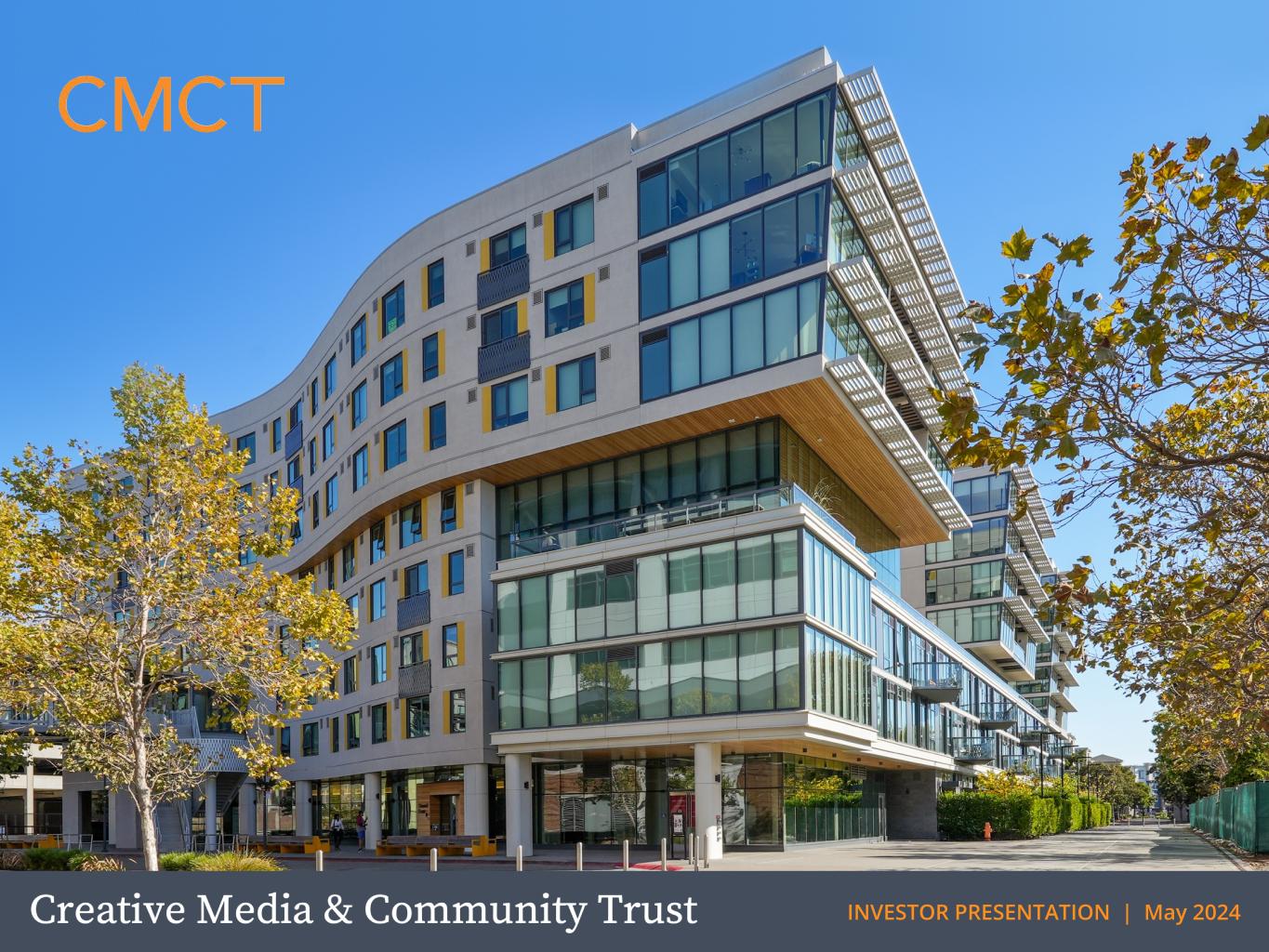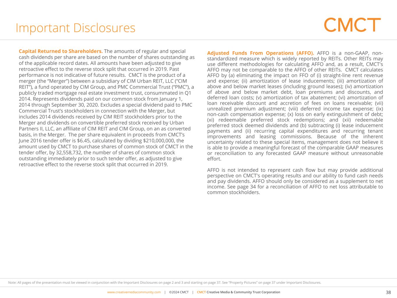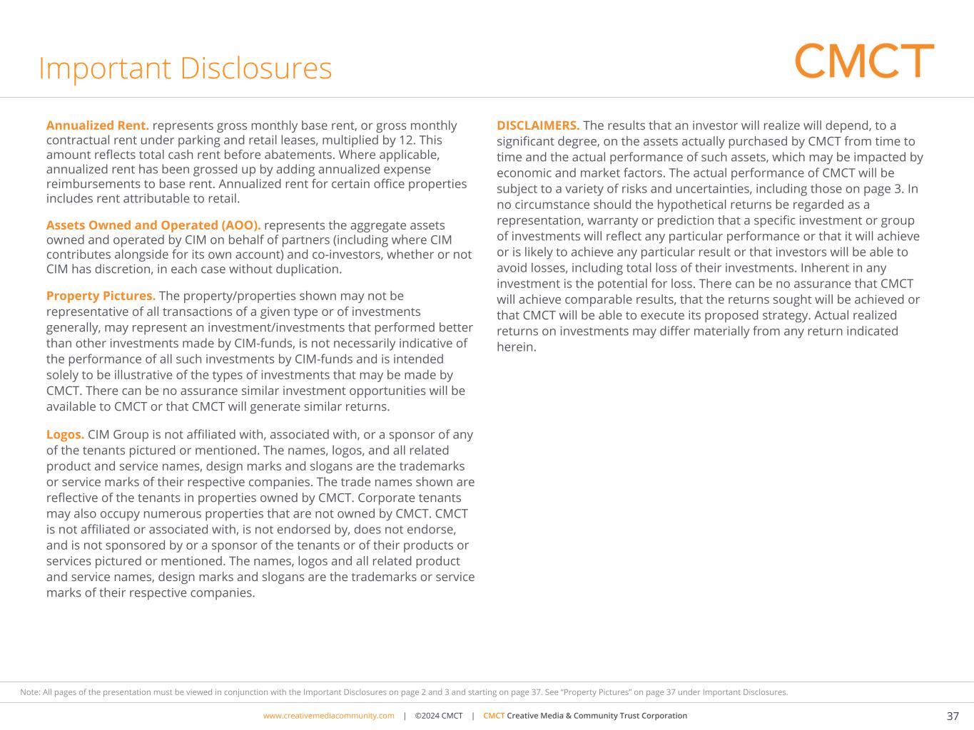 www.cimgroup.com | ©2018 CIM Group | TRADE SECRET / CONFIDENTIAL INFORMATIONwww.creativemediacommunity.com | ©2024 CMCT | CMCT Creative Media & Community Trust Corporation 37 Note: All pages of the presentation must be viewed in conjunction with the Important Disclosures on page 2 and 3 and starting on page 37. See “Property Pictures” on page 37 under Important Disclosures. Important Disclosures Annualized Rent. represents gross monthly base rent, or gross monthly contractual rent under parking and retail leases, multiplied by 12. This amount reflects total cash rent before abatements. Where applicable, annualized rent has been grossed up by adding annualized expense reimbursements to base rent. Annualized rent for certain office properties includes rent attributable to retail. Assets Owned and Operated (AOO). represents the aggregate assets owned and operated by CIM on behalf of partners (including where CIM contributes alongside for its own account) and co-investors, whether or not CIM has discretion, in each case without duplication. Property Pictures. The property/properties shown may not be representative of all transactions of a given type or of investments generally, may represent an investment/investments that performed better than other investments made by CIM-funds, is not necessarily indicative of the performance of all such investments by CIM-funds and is intended solely to be illustrative of the types of investments that may be made by CMCT. There can be no assurance similar investment opportunities will be available to CMCT or that CMCT will generate similar returns. Logos. CIM Group is not affiliated with, associated with, or a sponsor of any of the tenants pictured or mentioned. The names, logos, and all related product and service names, design marks and slogans are the trademarks or service marks of their respective companies. The trade names shown are reflective of the tenants in properties owned by CMCT. Corporate tenants may also occupy numerous properties that are not owned by CMCT. CMCT is not affiliated or associated with, is not endorsed by, does not endorse, and is not sponsored by or a sponsor of the tenants or of their products or services pictured or mentioned. The names, logos and all related product and service names, design marks and slogans are the trademarks or service marks of their respective companies. DISCLAIMERS. The results that an investor will realize will depend, to a significant degree, on the assets actually purchased by CMCT from time to time and the actual performance of such assets, which may be impacted by economic and market factors. The actual performance of CMCT will be subject to a variety of risks and uncertainties, including those on page 3. In no circumstance should the hypothetical returns be regarded as a representation, warranty or prediction that a specific investment or group of investments will reflect any particular performance or that it will achieve or is likely to achieve any particular result or that investors will be able to avoid losses, including total loss of their investments. Inherent in any investment is the potential for loss. There can be no assurance that CMCT will achieve comparable results, that the returns sought will be achieved or that CMCT will be able to execute its proposed strategy. Actual realized returns on investments may differ materially from any return indicated herein.