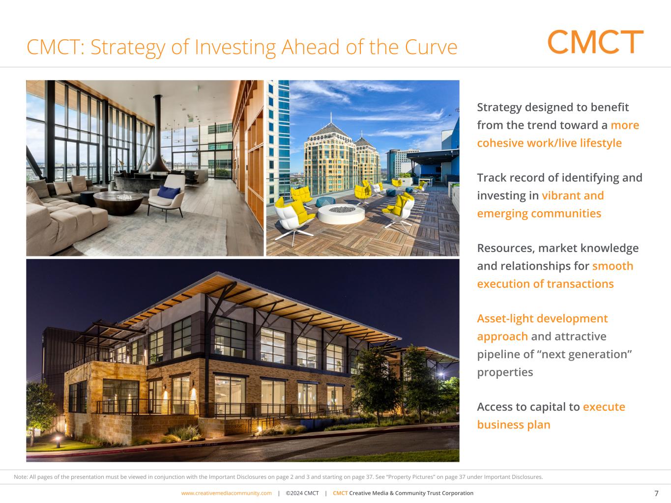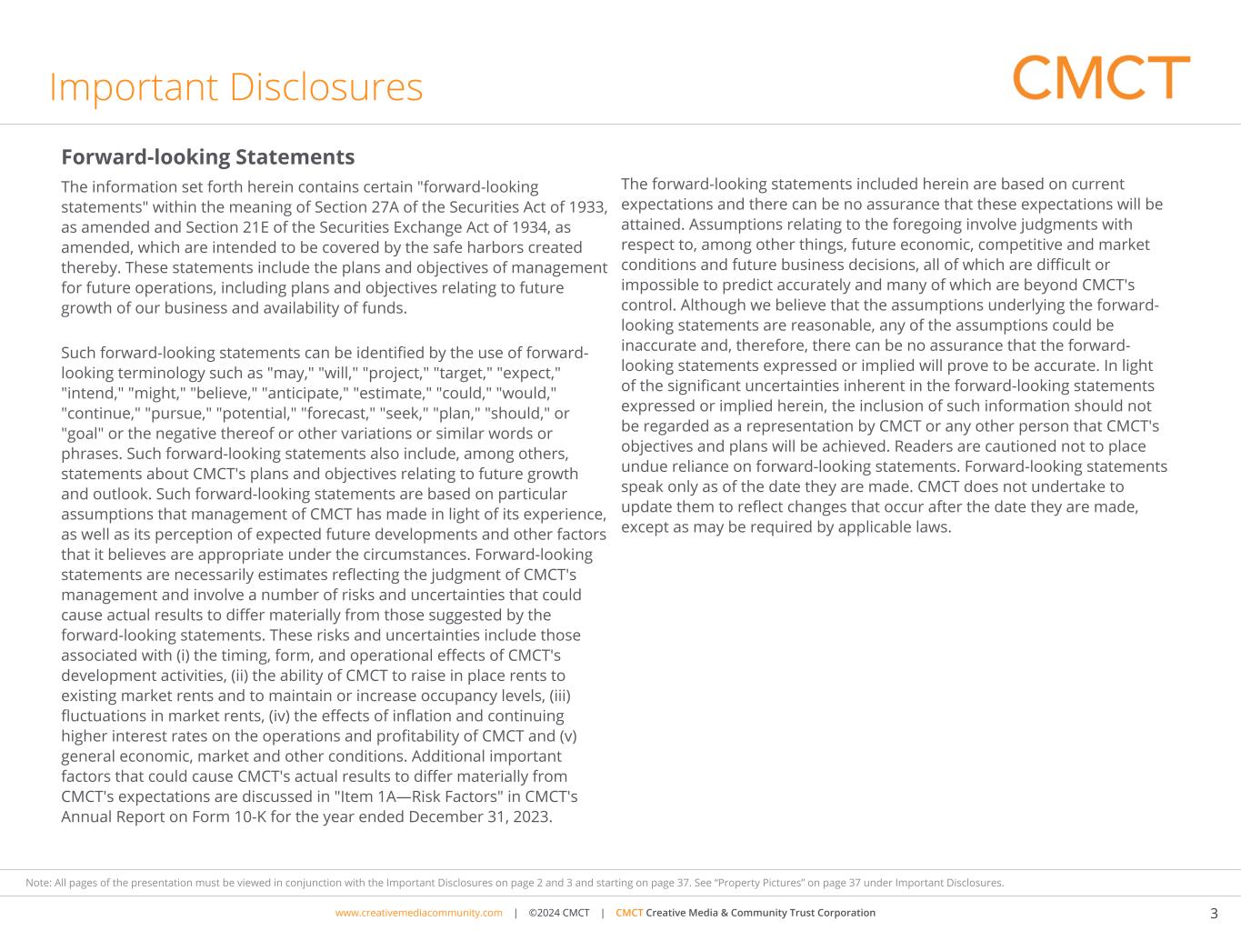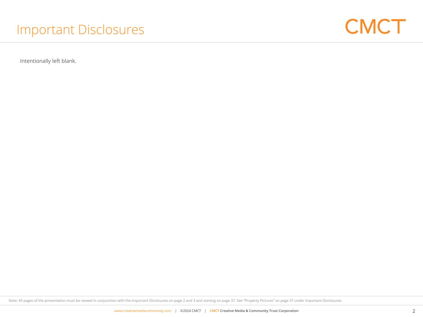 www.cimgroup.com | ©2018 CIM Group | TRADE SECRET / CONFIDENTIAL INFORMATIONwww.creativemediacommunity.com | ©2024 CMCT | CMCT Creative Media & Community Trust Corporation 2 Note: All pages of the presentation must be viewed in conjunction with the Important Disclosures on page 2 and 3 and starting on page 37. See “Property Pictures” on page 37 under Important Disclosures. Important Disclosures Intentionally left blank.