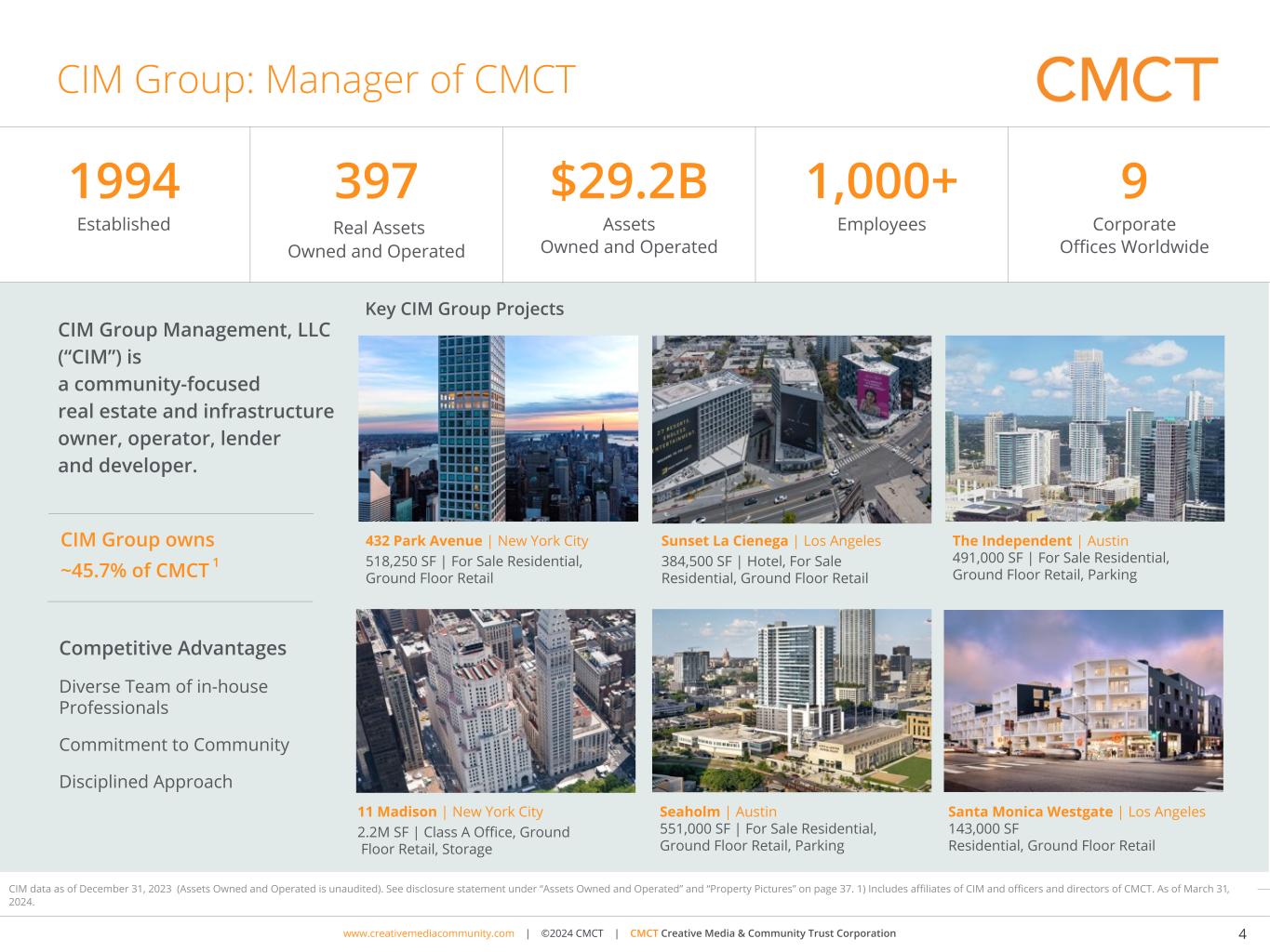 www.cimgroup.com | ©2018 CIM Group | TRADE SECRET / CONFIDENTIAL INFORMATIONwww.creativemediacommunity.com | ©2024 CMCT | CMCT Creative Media & Community Trust Corporation 3 Note: All pages of the presentation must be viewed in conjunction with the Important Disclosures on page 2 and 3 and starting on page 37. See “Property Pictures” on page 37 under Important Disclosures. Important Disclosures Forward-looking Statements The information set forth herein contains certain "forward-looking statements" within the meaning of Section 27A of the Securities Act of 1933, as amended and Section 21E of the Securities Exchange Act of 1934, as amended, which are intended to be covered by the safe harbors created thereby. These statements include the plans and objectives of management for future operations, including plans and objectives relating to future growth of our business and availability of funds. Such forward-looking statements can be identified by the use of forward- looking terminology such as "may," "will," "project," "target," "expect," "intend," "might," "believe," "anticipate," "estimate," "could," "would," "continue," "pursue," "potential," "forecast," "seek," "plan," "should," or "goal" or the negative thereof or other variations or similar words or phrases. Such forward-looking statements also include, among others, statements about CMCT's plans and objectives relating to future growth and outlook. Such forward-looking statements are based on particular assumptions that management of CMCT has made in light of its experience, as well as its perception of expected future developments and other factors that it believes are appropriate under the circumstances. Forward-looking statements are necessarily estimates reflecting the judgment of CMCT's management and involve a number of risks and uncertainties that could cause actual results to differ materially from those suggested by the forward-looking statements. These risks and uncertainties include those associated with (i) the timing, form, and operational effects of CMCT's development activities, (ii) the ability of CMCT to raise in place rents to existing market rents and to maintain or increase occupancy levels, (iii) fluctuations in market rents, (iv) the effects of inflation and continuing higher interest rates on the operations and profitability of CMCT and (v) general economic, market and other conditions. Additional important factors that could cause CMCT's actual results to differ materially from CMCT's expectations are discussed in "Item 1A—Risk Factors" in CMCT's Annual Report on Form 10-K for the year ended December 31, 2023. The forward-looking statements included herein are based on current expectations and there can be no assurance that these expectations will be attained. Assumptions relating to the foregoing involve judgments with respect to, among other things, future economic, competitive and market conditions and future business decisions, all of which are difficult or impossible to predict accurately and many of which are beyond CMCT's control. Although we believe that the assumptions underlying the forward- looking statements are reasonable, any of the assumptions could be inaccurate and, therefore, there can be no assurance that the forward- looking statements expressed or implied will prove to be accurate. In light of the significant uncertainties inherent in the forward-looking statements expressed or implied herein, the inclusion of such information should not be regarded as a representation by CMCT or any other person that CMCT's objectives and plans will be achieved. Readers are cautioned not to place undue reliance on forward-looking statements. Forward-looking statements speak only as of the date they are made. CMCT does not undertake to update them to reflect changes that occur after the date they are made, except as may be required by applicable laws.