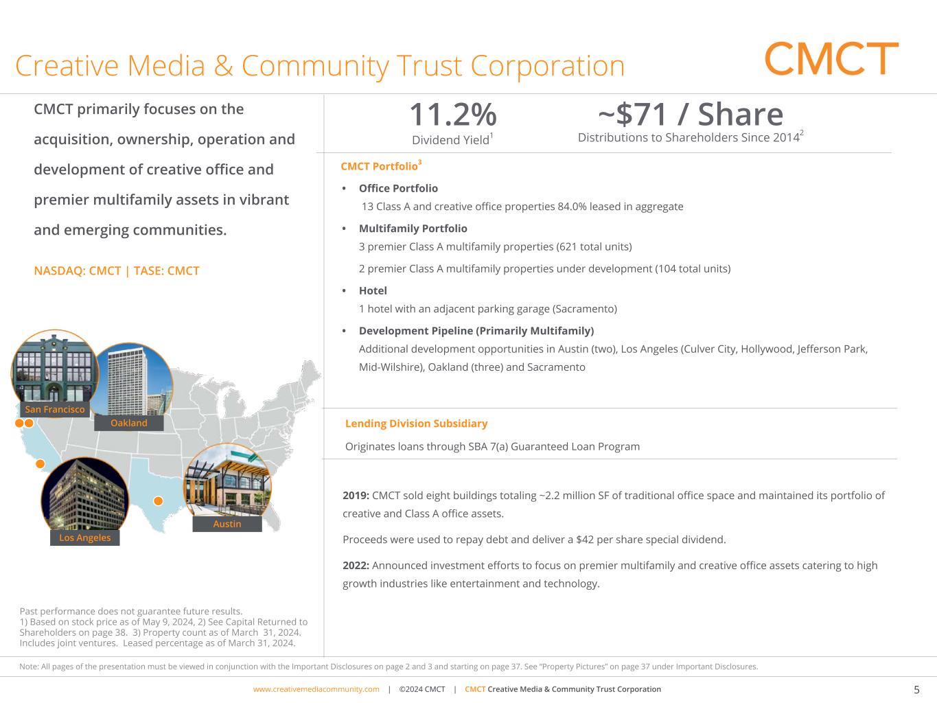 www.cimgroup.com | ©2018 CIM Group | TRADE SECRET / CONFIDENTIAL INFORMATIONwww.creativemediacommunity.com | ©2024 CMCT | CMCT Creative Media & Community Trust Corporation 4 Note: All pages of the presentation must be viewed in conjunction with the Important Disclosures on page 2 and 3 and starting on page 37. See “Property Pictures” on page 37 under Important Disclosures. CIM Group: Manager of CMCT CIM data as of December 31, 2023 (Assets Owned and Operated is unaudited). See disclosure statement under “Assets Owned and Operated” and “Property Pictures” on page 37. 1) Includes affiliates of CIM and officers and directors of CMCT. As of March 31, 2024. CIM Group Management, LLC (“CIM”) is a community-focused real estate and infrastructure owner, operator, lender and developer. The Independent | Austin 491,000 SF | For Sale Residential, Ground Floor Retail, Parking Key CIM Group Projects Santa Monica Westgate | Los Angeles 143,000 SF Residential, Ground Floor Retail Sunset La Cienega | Los Angeles 384,500 SF | Hotel, For Sale Residential, Ground Floor Retail Seaholm | Austin 551,000 SF | For Sale Residential, Ground Floor Retail, Parking 432 Park Avenue | New York City 518,250 SF | For Sale Residential, Ground Floor Retail 11 Madison | New York City 2.2M SF | Class A Office, Ground Floor Retail, Storage 1994 Established 397 Real Assets Owned and Operated $29.2B Assets Owned and Operated 1,000+ Employees 9 Corporate Offices Worldwide CIM Group owns ~45.7% of CMCT 1 Competitive Advantages Diverse Team of in-house Professionals Commitment to Community Disciplined Approach