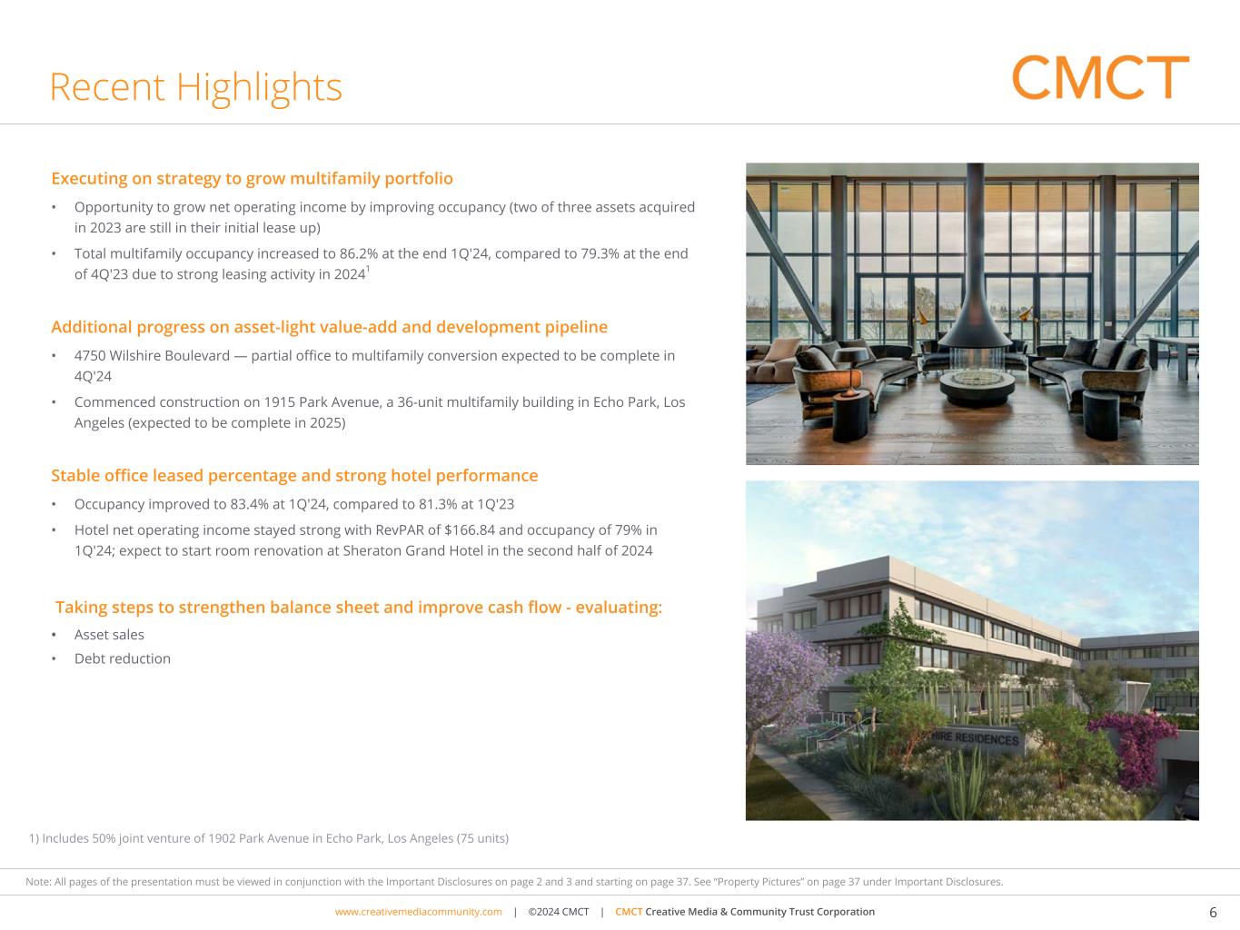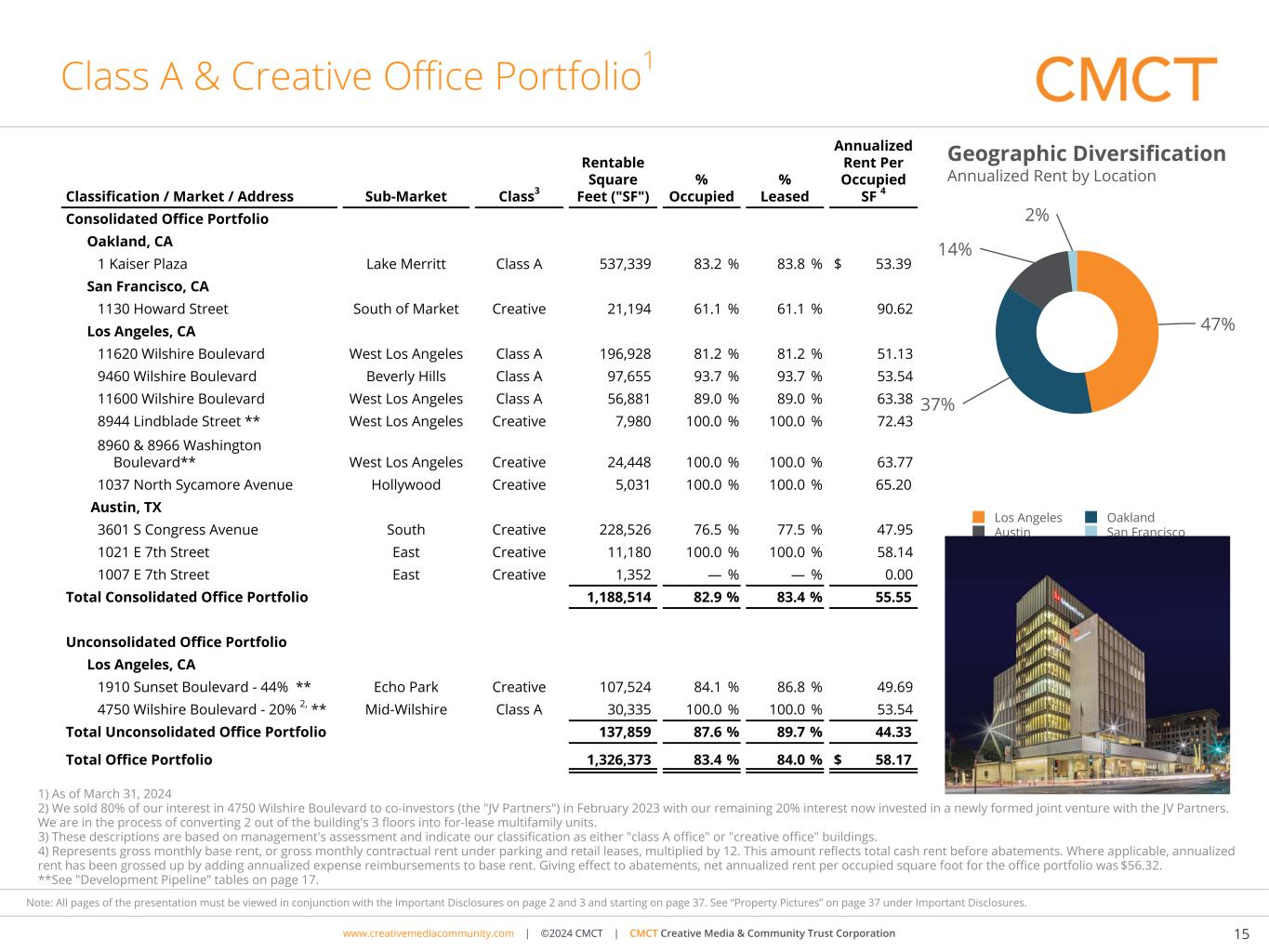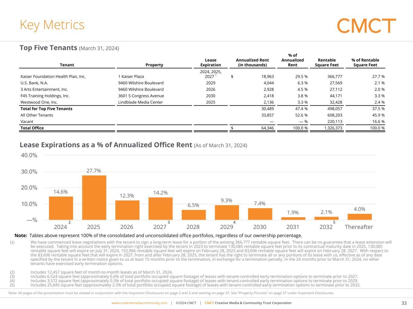 www.cimgroup.com | ©2018 CIM Group | TRADE SECRET / CONFIDENTIAL INFORMATIONwww.creativemediacommunity.com | ©2024 CMCT | CMCT Creative Media & Community Trust Corporation 33 Note: All pages of the presentation must be viewed in conjunction with the Important Disclosures on page 2 and 3 and starting on page 37. See “Property Pictures” on page 37 under Important Disclosures. Key Metrics Lease Expirations as a % of Annualized Office Rent (As of March 31, 2024) Top Five Tenants (March 31, 2024) (1) We have commenced lease negotiations with the tenant to sign a long-term lease for a portion of the existing 366,777 rentable square feet. There can be no guarantee that a lease extension will be executed. Taking into account the early termination right exercised by the tenant in 2023 to terminate 130,085 rentable square feet prior to its contractual maturity date in 2025, 130,085 rentable square feet will expire on July 31, 2024, 152,966 rentable square feet will expire on February 28, 2025 and 83,696 rentable square feet will expire on February 28, 2027. With respect to the 83,696 rentable square feet that will expire in 2027, from and after February 28, 2025, the tenant has the right to terminate all or any portions of its lease with us, effective as of any date specified by the tenant in a written notice given to us at least 15 months prior to the termination, in exchange for a termination penalty. In the 24 months prior to March 31, 2024, no other tenants have exercised early termination options. (2) Includes 12,457 square feet of month-to-month leases as of March 31, 2024. (3) Includes 6,524 square feet (approximately 0.6% of total portfolio occupied square footage) of leases with tenant-controlled early termination options to terminate prior to 2027. (4) Includes 3,572 square feet (approximately 0.3% of total portfolio occupied square footage) of leases with tenant-controlled early termination options to terminate prior to 2029. (5) Includes 25,845 square feet (approximately 2.3% of total portfolio occupied square footage) of leases with tenant-controlled early termination options to terminate prior to 2032. 14.6% 27.7% 12.3% 14.2% 6.5% 9.3% 7.4% 1.9% 2.1% 4.0% 2024 2025 2026 2027 2028 2029 2030 2031 2032 Thereafter —% 10.0% 20.0% 30.0% 40.0% Tenant Property Lease Expiration Annualized Rent (in thousands) % of Annualized Rent Rentable Square Feet % of Rentable Square Feet Kaiser Foundation Health Plan, Inc. 1 Kaiser Plaza 2024, 2025, 2027 1 $ 18,963 29.5 % 366,777 27.7 % U.S. Bank, N.A. 9460 Wilshire Boulevard 2029 4,044 6.3 % 27,569 2.1 % 3 Arts Entertainment, Inc. 9460 Wilshire Boulevard 2026 2,928 4.5 % 27,112 2.0 % F45 Training Holdings, Inc. 3601 S Congress Avenue 2030 2,418 3.8 % 44,171 3.3 % Westwood One, Inc. Lindblade Media Center 2025 2,136 3.3 % 32,428 2.4 % Total for Top Five Tenants 30,489 47.4 % 498,057 37.5 % All Other Tenants 33,857 52.6 % 608,203 45.9 % Vacant — — % 220,113 16.6 % Total Office $ 64,346 100.0 % 1,326,373 100.0 % 2 Note: Tables above represent 100% of the consolidated and unconsolidated office portfolios, regardless of our ownership percentage. 3 4 5