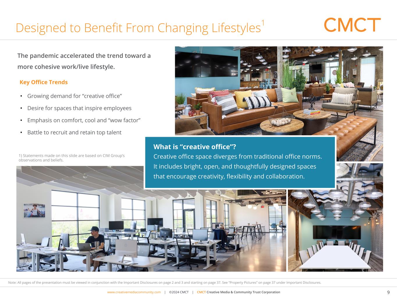 www.cimgroup.com | ©2018 CIM Group | TRADE SECRET / CONFIDENTIAL INFORMATIONwww.creativemediacommunity.com | ©2024 CMCT | CMCT Creative Media & Community Trust Corporation 8 Note: All pages of the presentation must be viewed in conjunction with the Important Disclosures on page 2 and 3 and starting on page 37. See “Property Pictures” on page 37 under Important Disclosures. Designed to Benefit From Changing Lifestyles1 Key Multifamily Trends Walkability Luxury Amenities Well-Connected Hybrid Work Lifestyle Culture-Oriented Locations Vibrant Neighborhoods in Major U.S. Markets 1) Statements made on this slide are based on CIM’s observations and beliefs. First Quarter 2023 Acquisitions Channel House Jack London Square, Oakland Parkview Living Echo Park, Los Angeles Eleven Fifty Clay Oakland Eleven Fifty Clay