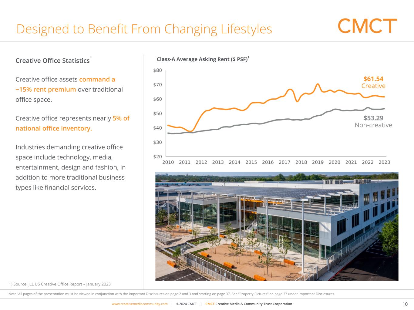 www.cimgroup.com | ©2018 CIM Group | TRADE SECRET / CONFIDENTIAL INFORMATIONwww.creativemediacommunity.com | ©2024 CMCT | CMCT Creative Media & Community Trust Corporation 9 Note: All pages of the presentation must be viewed in conjunction with the Important Disclosures on page 2 and 3 and starting on page 37. See “Property Pictures” on page 37 under Important Disclosures. Designed to Benefit From Changing Lifestyles1 The pandemic accelerated the trend toward a more cohesive work/live lifestyle. 1) Statements made on this slide are based on CIM Group’s observations and beliefs. Key Office Trends • Growing demand for “creative office” • Desire for spaces that inspire employees • Emphasis on comfort, cool and “wow factor” • Battle to recruit and retain top talent What is “creative office”? Creative office space diverges from traditional office norms. It includes bright, open, and thoughtfully designed spaces that encourage creativity, flexibility and collaboration.