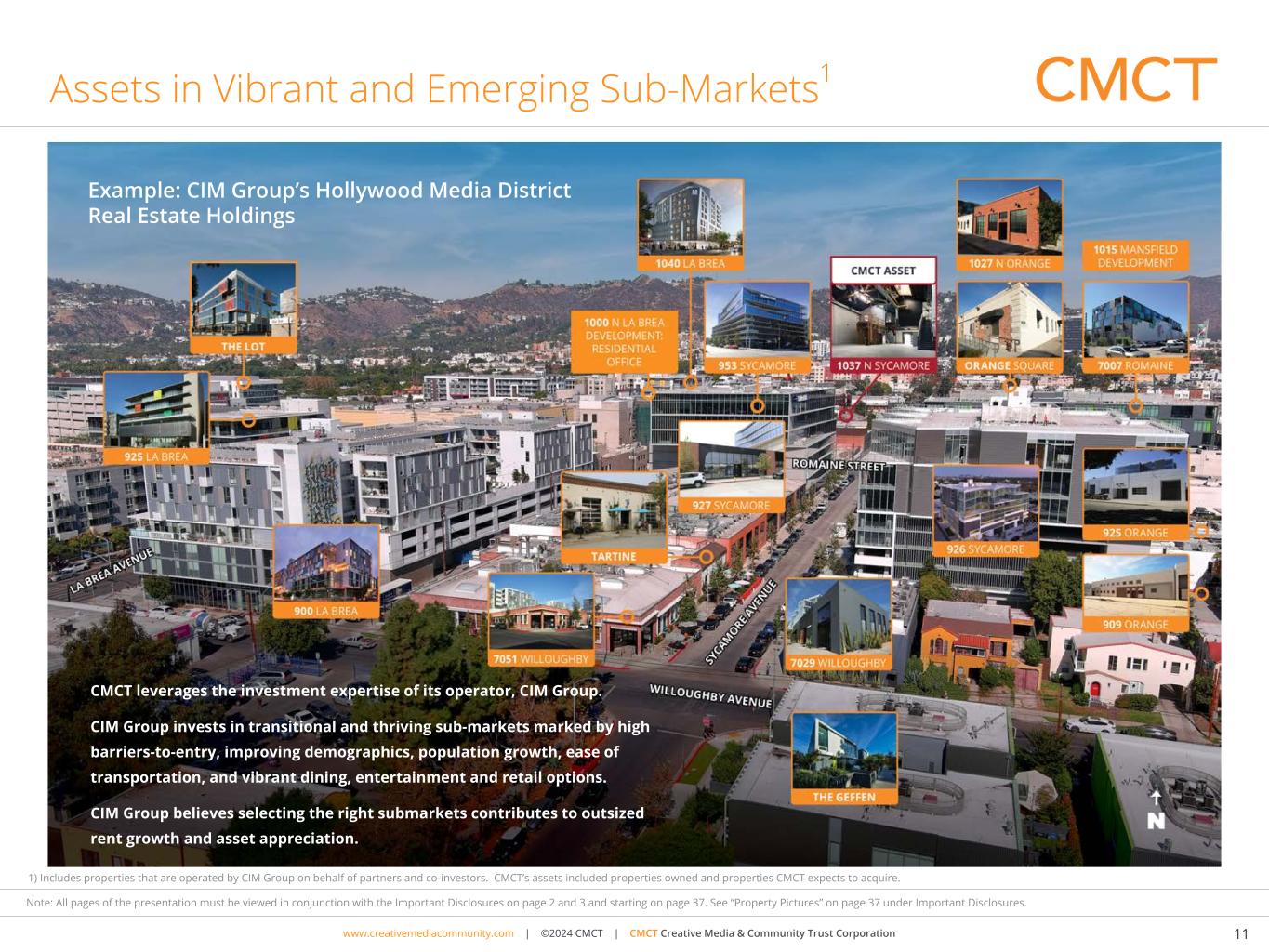 www.cimgroup.com | ©2018 CIM Group | TRADE SECRET / CONFIDENTIAL INFORMATIONwww.creativemediacommunity.com | ©2024 CMCT | CMCT Creative Media & Community Trust Corporation 10 Note: All pages of the presentation must be viewed in conjunction with the Important Disclosures on page 2 and 3 and starting on page 37. See “Property Pictures” on page 37 under Important Disclosures. Designed to Benefit From Changing Lifestyles Creative Office Statistics1 Creative office assets command a ~15% rent premium over traditional office space. Creative office represents nearly 5% of national office inventory. Industries demanding creative office space include technology, media, entertainment, design and fashion, in addition to more traditional business types like financial services. 1) Source: JLL US Creative Office Report – January 2023 Class-A Average Asking Rent ($ PSF)1 $61.54 Creative $53.29 Non-creative