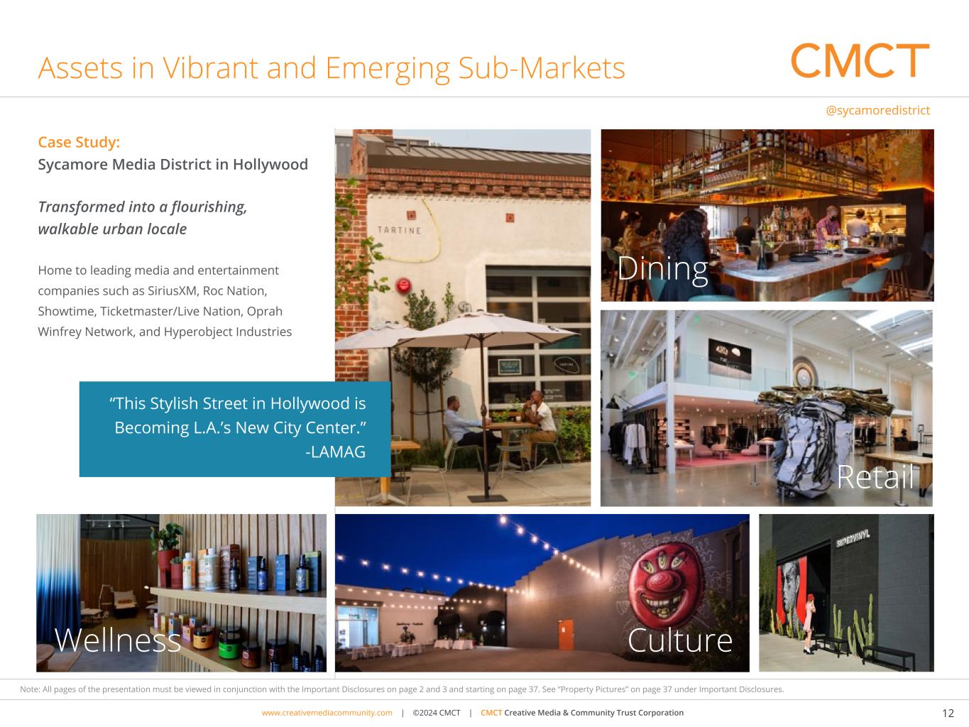 www.cimgroup.com | ©2018 CIM Group | TRADE SECRET / CONFIDENTIAL INFORMATIONwww.creativemediacommunity.com | ©2024 CMCT | CMCT Creative Media & Community Trust Corporation 11 Note: All pages of the presentation must be viewed in conjunction with the Important Disclosures on page 2 and 3 and starting on page 37. See “Property Pictures” on page 37 under Important Disclosures. Assets in Vibrant and Emerging Sub-Markets1 CMCT leverages the investment expertise of its operator, CIM Group. CIM Group invests in transitional and thriving sub-markets marked by high barriers-to-entry, improving demographics, population growth, ease of transportation, and vibrant dining, entertainment and retail options. CIM Group believes selecting the right submarkets contributes to outsized rent growth and asset appreciation. Example: CIM Group’s Hollywood Media District Real Estate Holdings 1) Includes properties that are operated by CIM Group on behalf of partners and co-investors. CMCT’s assets included properties owned and properties CMCT expects to acquire.