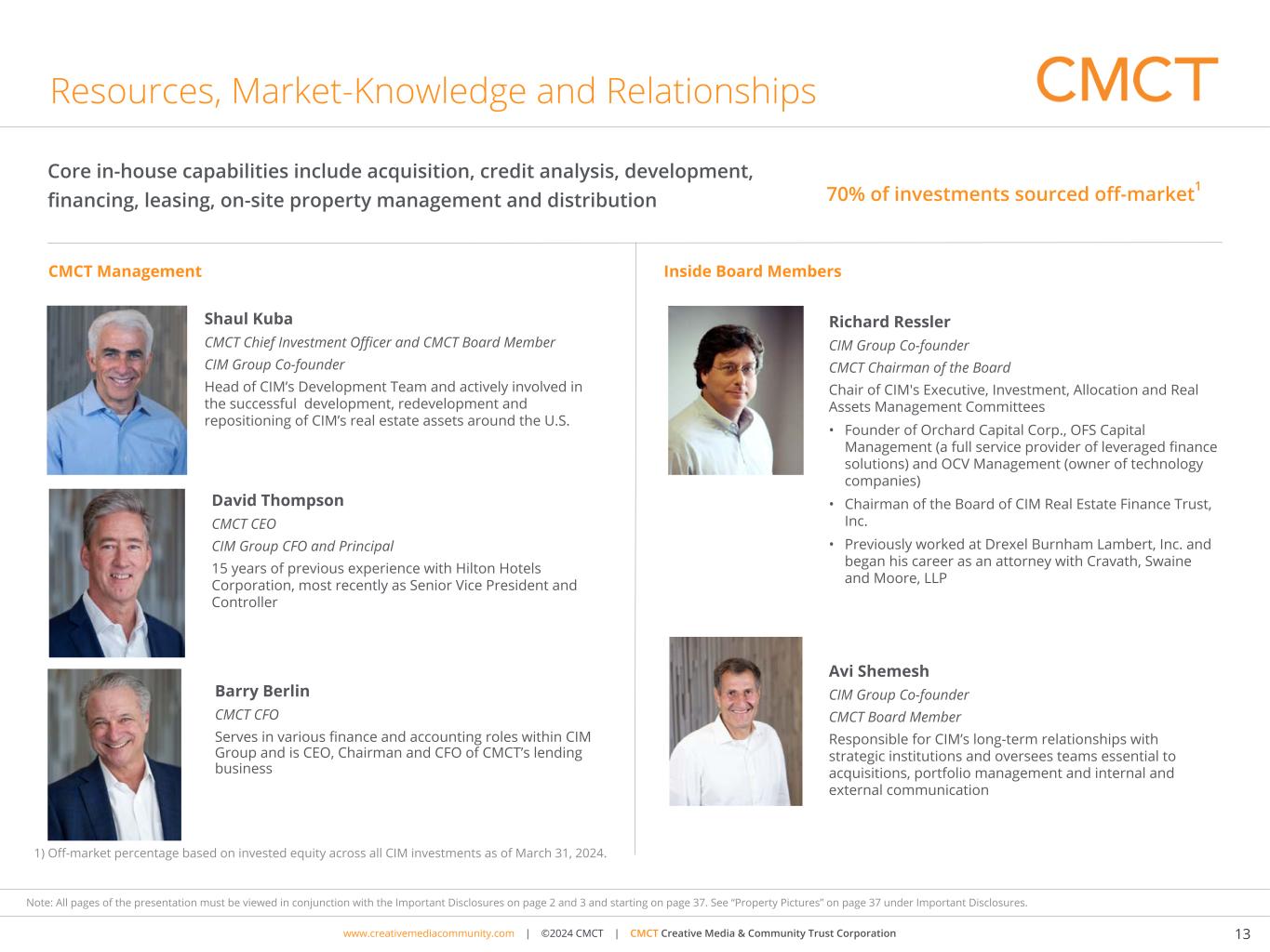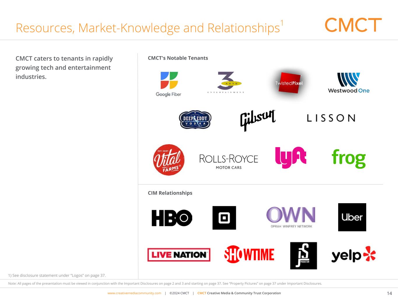 www.cimgroup.com | ©2018 CIM Group | TRADE SECRET / CONFIDENTIAL INFORMATIONwww.creativemediacommunity.com | ©2024 CMCT | CMCT Creative Media & Community Trust Corporation 13 Note: All pages of the presentation must be viewed in conjunction with the Important Disclosures on page 2 and 3 and starting on page 37. See “Property Pictures” on page 37 under Important Disclosures. Resources, Market-Knowledge and Relationships Core in-house capabilities include acquisition, credit analysis, development, financing, leasing, on-site property management and distribution CMCT Management 1) Off-market percentage based on invested equity across all CIM investments as of March 31, 2024. Inside Board Members Barry Berlin CMCT CFO Serves in various finance and accounting roles within CIM Group and is CEO, Chairman and CFO of CMCT’s lending business Avi Shemesh CIM Group Co-founder CMCT Board Member Responsible for CIM’s long-term relationships with strategic institutions and oversees teams essential to acquisitions, portfolio management and internal and external communication Richard Ressler CIM Group Co-founder CMCT Chairman of the Board Chair of CIM's Executive, Investment, Allocation and Real Assets Management Committees • Founder of Orchard Capital Corp., OFS Capital Management (a full service provider of leveraged finance solutions) and OCV Management (owner of technology companies) • Chairman of the Board of CIM Real Estate Finance Trust, Inc. • Previously worked at Drexel Burnham Lambert, Inc. and began his career as an attorney with Cravath, Swaine and Moore, LLP 70% of investments sourced off-market1 Shaul Kuba CMCT Chief Investment Officer and CMCT Board Member CIM Group Co-founder Head of CIM’s Development Team and actively involved in the successful development, redevelopment and repositioning of CIM’s real estate assets around the U.S. David Thompson CMCT CEO CIM Group CFO and Principal 15 years of previous experience with Hilton Hotels Corporation, most recently as Senior Vice President and Controller
