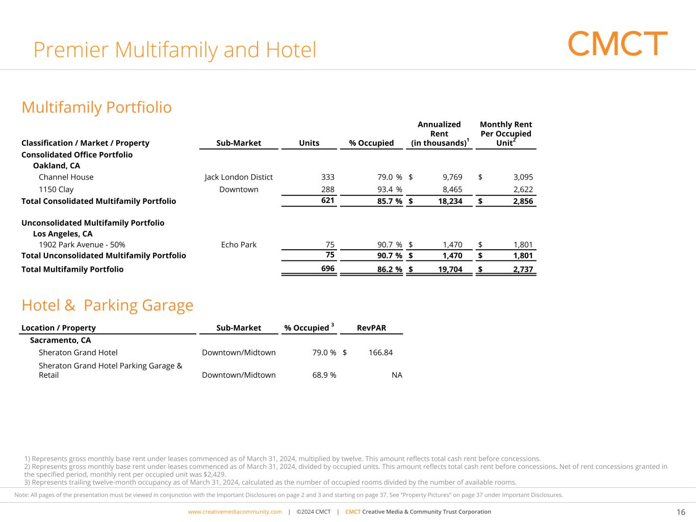 www.cimgroup.com | ©2018 CIM Group | TRADE SECRET / CONFIDENTIAL INFORMATIONwww.creativemediacommunity.com | ©2024 CMCT | CMCT Creative Media & Community Trust Corporation 15 Note: All pages of the presentation must be viewed in conjunction with the Important Disclosures on page 2 and 3 and starting on page 37. See “Property Pictures” on page 37 under Important Disclosures. Class A & Creative Office Portfolio1 Classification / Market / Address Sub-Market Class3 Rentable Square Feet ("SF") % Occupied % Leased Annualized Rent Per Occupied SF 4 Consolidated Office Portfolio Oakland, CA 1 Kaiser Plaza Lake Merritt Class A 537,339 83.2 % 83.8 % $ 53.39 San Francisco, CA 1130 Howard Street South of Market Creative 21,194 61.1 % 61.1 % 90.62 Los Angeles, CA 11620 Wilshire Boulevard West Los Angeles Class A 196,928 81.2 % 81.2 % 51.13 9460 Wilshire Boulevard Beverly Hills Class A 97,655 93.7 % 93.7 % 53.54 11600 Wilshire Boulevard West Los Angeles Class A 56,881 89.0 % 89.0 % 63.38 8944 Lindblade Street ** West Los Angeles Creative 7,980 100.0 % 100.0 % 72.43 8960 & 8966 Washington Boulevard** West Los Angeles Creative 24,448 100.0 % 100.0 % 63.77 1037 North Sycamore Avenue Hollywood Creative 5,031 100.0 % 100.0 % 65.20 Austin, TX 3601 S Congress Avenue South Creative 228,526 76.5 % 77.5 % 47.95 1021 E 7th Street East Creative 11,180 100.0 % 100.0 % 58.14 1007 E 7th Street East Creative 1,352 — % — % 0.00 Total Consolidated Office Portfolio 1,188,514 82.9 % 83.4 % 55.55 Unconsolidated Office Portfolio Los Angeles, CA 1910 Sunset Boulevard - 44% ** Echo Park Creative 107,524 84.1 % 86.8 % 49.69 4750 Wilshire Boulevard - 20% 2, ** Mid-Wilshire Class A 30,335 100.0 % 100.0 % 53.54 Total Unconsolidated Office Portfolio 137,859 87.6 % 89.7 % 44.33 Total Office Portfolio 1,326,373 83.4 % 84.0 % $ 58.17 47% 37% 14% 2% Los Angeles Oakland Austin San Francisco 1) As of March 31, 2024 2) We sold 80% of our interest in 4750 Wilshire Boulevard to co-investors (the "JV Partners") in February 2023 with our remaining 20% interest now invested in a newly formed joint venture with the JV Partners. We are in the process of converting 2 out of the building's 3 floors into for-lease multifamily units. 3) These descriptions are based on management's assessment and indicate our classification as either "class A office" or "creative office" buildings. 4) Represents gross monthly base rent, or gross monthly contractual rent under parking and retail leases, multiplied by 12. This amount reflects total cash rent before abatements. Where applicable, annualized rent has been grossed up by adding annualized expense reimbursements to base rent. Giving effect to abatements, net annualized rent per occupied square foot for the office portfolio was $56.32. **See "Development Pipeline” tables on page 17. Geographic Diversification Annualized Rent by Location