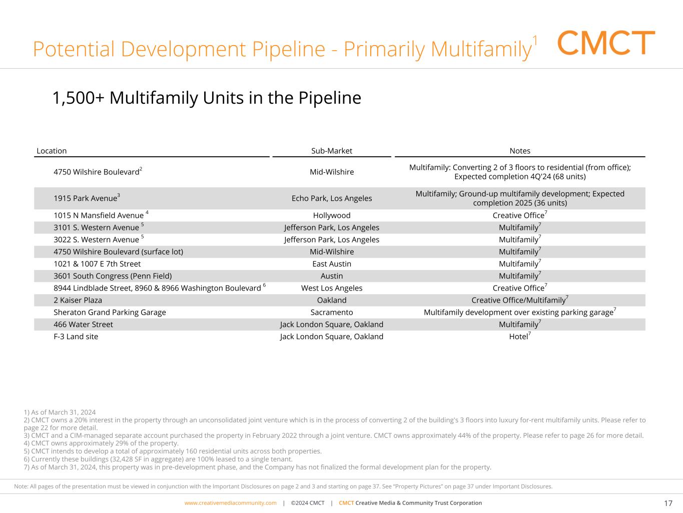 www.cimgroup.com | ©2018 CIM Group | TRADE SECRET / CONFIDENTIAL INFORMATIONwww.creativemediacommunity.com | ©2024 CMCT | CMCT Creative Media & Community Trust Corporation 16 Note: All pages of the presentation must be viewed in conjunction with the Important Disclosures on page 2 and 3 and starting on page 37. See “Property Pictures” on page 37 under Important Disclosures. 1) Represents gross monthly base rent under leases commenced as of March 31, 2024, multiplied by twelve. This amount reflects total cash rent before concessions. 2) Represents gross monthly base rent under leases commenced as of March 31, 2024, divided by occupied units. This amount reflects total cash rent before concessions. Net of rent concessions granted in the specified period, monthly rent per occupied unit was $2,429. 3) Represents trailing twelve-month occupancy as of March 31, 2024, calculated as the number of occupied rooms divided by the number of available rooms. Premier Multifamily and Hotel Multifamily Portfiolio Classification / Market / Property Sub-Market Units % Occupied Annualized Rent (in thousands)1 Monthly Rent Per Occupied Unit2 Consolidated Office Portfolio Oakland, CA Channel House Jack London Distict 333 79.0 % $ 9,769 $ 3,095 1150 Clay Downtown 288 93.4 % 8,465 2,622 Total Consolidated Multifamily Portfolio 621 85.7 % $ 18,234 $ 2,856 Unconsolidated Multifamily Portfolio Los Angeles, CA 1902 Park Avenue - 50% Echo Park 75 90.7 % $ 1,470 $ 1,801 Total Unconsolidated Multifamily Portfolio 75 90.7 % $ 1,470 $ 1,801 Total Multifamily Portfolio 696 86.2 % $ 19,704 $ 2,737 Hotel & Parking Garage Location / Property Sub-Market % Occupied 3 RevPAR Sacramento, CA Sheraton Grand Hotel Downtown/Midtown 79.0 % $ 166.84 Sheraton Grand Hotel Parking Garage & Retail Downtown/Midtown 68.9 % NA