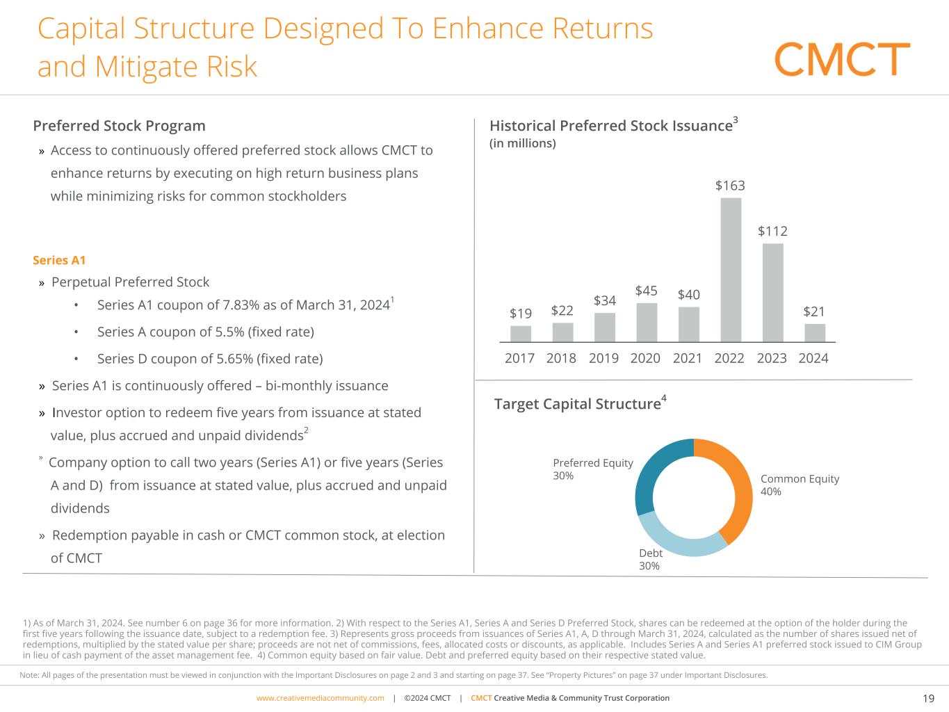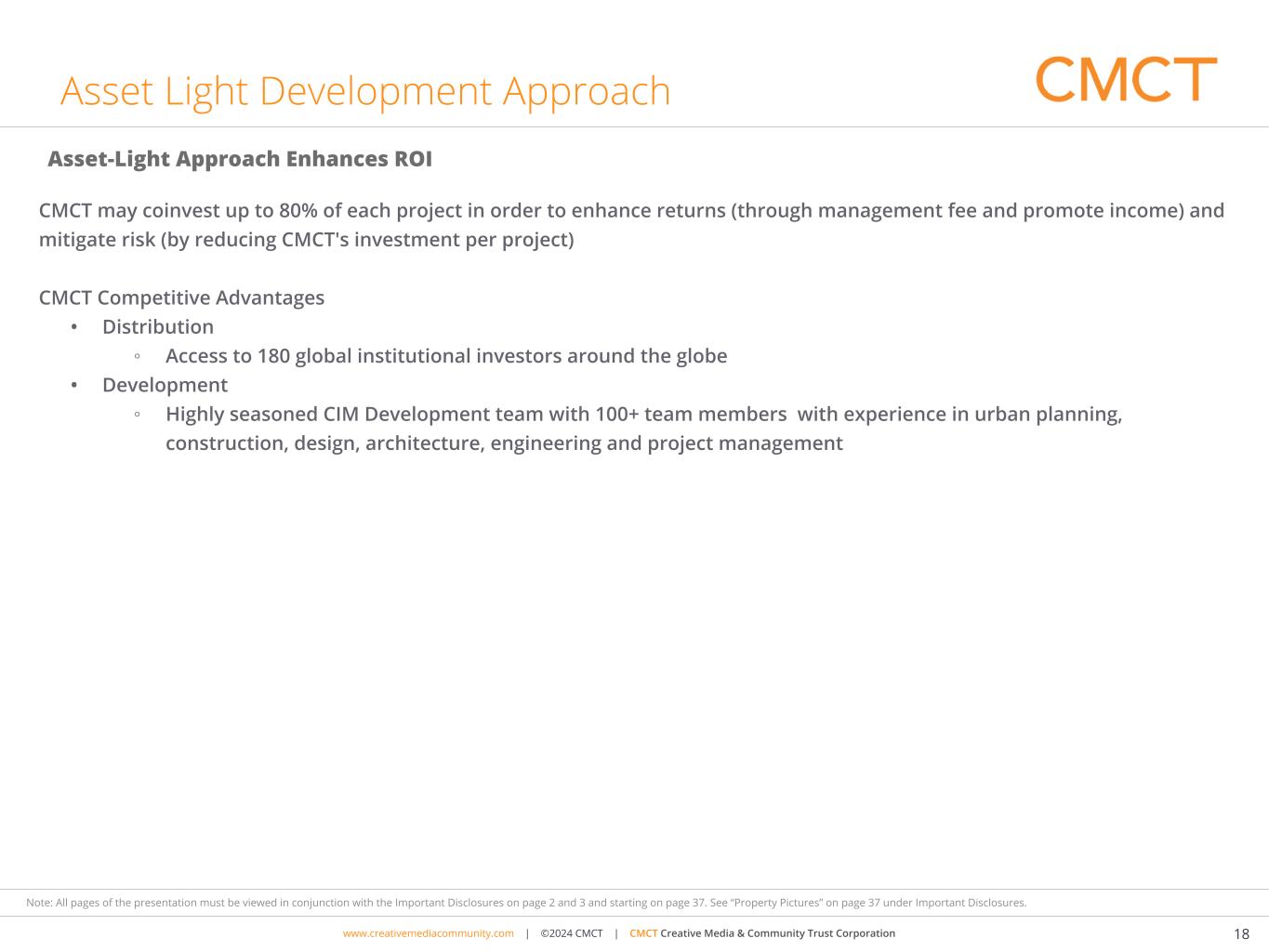 www.cimgroup.com | ©2018 CIM Group | TRADE SECRET / CONFIDENTIAL INFORMATIONwww.creativemediacommunity.com | ©2024 CMCT | CMCT Creative Media & Community Trust Corporation 18 Note: All pages of the presentation must be viewed in conjunction with the Important Disclosures on page 2 and 3 and starting on page 37. See “Property Pictures” on page 37 under Important Disclosures. Asset Light Development Approach CMCT may coinvest up to 80% of each project in order to enhance returns (through management fee and promote income) and mitigate risk (by reducing CMCT's investment per project) CMCT Competitive Advantages • Distribution ◦ Access to 180 global institutional investors around the globe • Development ◦ Highly seasoned CIM Development team with 100+ team members with experience in urban planning, construction, design, architecture, engineering and project management Asset-Light Approach Enhances ROI