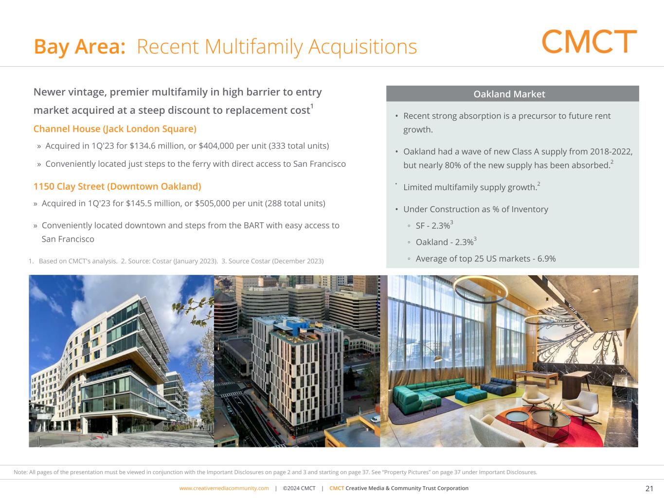 www.cimgroup.com | ©2018 CIM Group | TRADE SECRET / CONFIDENTIAL INFORMATIONwww.creativemediacommunity.com | ©2024 CMCT | CMCT Creative Media & Community Trust Corporation 21 Note: All pages of the presentation must be viewed in conjunction with the Important Disclosures on page 2 and 3 and starting on page 37. See “Property Pictures” on page 37 under Important Disclosures. Bay Area: Recent Multifamily Acquisitions Channel House (Jack London Square) » Acquired in 1Q'23 for $134.6 million, or $404,000 per unit (333 total units) » Conveniently located just steps to the ferry with direct access to San Francisco 1150 Clay Street (Downtown Oakland) » Acquired in 1Q'23 for $145.5 million, or $505,000 per unit (288 total units) » Conveniently located downtown and steps from the BART with easy access to San Francisco Oakland MarketNewer vintage, premier multifamily in high barrier to entry market acquired at a steep discount to replacement cost1 • Recent strong absorption is a precursor to future rent growth. • Oakland had a wave of new Class A supply from 2018-2022, but nearly 80% of the new supply has been absorbed.2 • Limited multifamily supply growth.2 • Under Construction as % of Inventory ◦ SF - 2.3%3 ◦ Oakland - 2.3%3 ◦ Average of top 25 US markets - 6.9%1. Based on CMCT's analysis. 2. Source: Costar (January 2023). 3. Source Costar (December 2023)