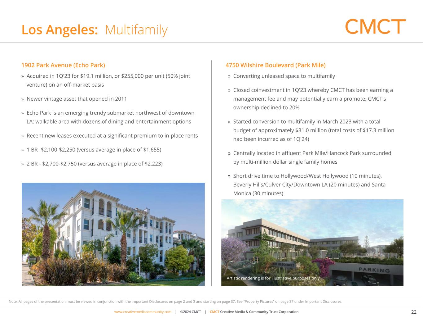 www.cimgroup.com | ©2018 CIM Group | TRADE SECRET / CONFIDENTIAL INFORMATIONwww.creativemediacommunity.com | ©2024 CMCT | CMCT Creative Media & Community Trust Corporation 22 Note: All pages of the presentation must be viewed in conjunction with the Important Disclosures on page 2 and 3 and starting on page 37. See “Property Pictures” on page 37 under Important Disclosures. Los Angeles: Multifamily 4750 Wilshire Boulevard (Park Mile) » Converting unleased space to multifamily » Closed coinvestment in 1Q'23 whereby CMCT has been earning a management fee and may potentially earn a promote; CMCT's ownership declined to 20% » Started conversion to multifamily in March 2023 with a total budget of approximately $31.0 million (total costs of $17.3 million had been incurred as of 1Q'24) » Centrally located in affluent Park Mile/Hancock Park surrounded by multi-million dollar single family homes » Short drive time to Hollywood/West Hollywood (10 minutes), Beverly Hills/Culver City/Downtown LA (20 minutes) and Santa Monica (30 minutes) 1902 Park Avenue (Echo Park) » Acquired in 1Q'23 for $19.1 million, or $255,000 per unit (50% joint venture) on an off-market basis » Newer vintage asset that opened in 2011 » Echo Park is an emerging trendy submarket northwest of downtown LA; walkable area with dozens of dining and entertainment options » Recent new leases executed at a significant premium to in-place rents » 1 BR- $2,100-$2,250 (versus average in place of $1,655) » 2 BR - $2,700-$2,750 (versus average in place of $2,223) Artistic rendering is for illustrative purposes only.