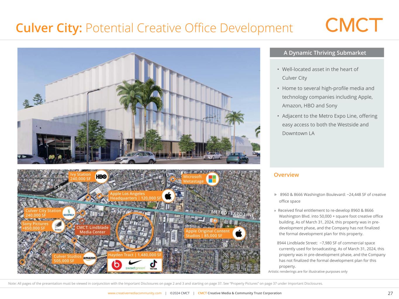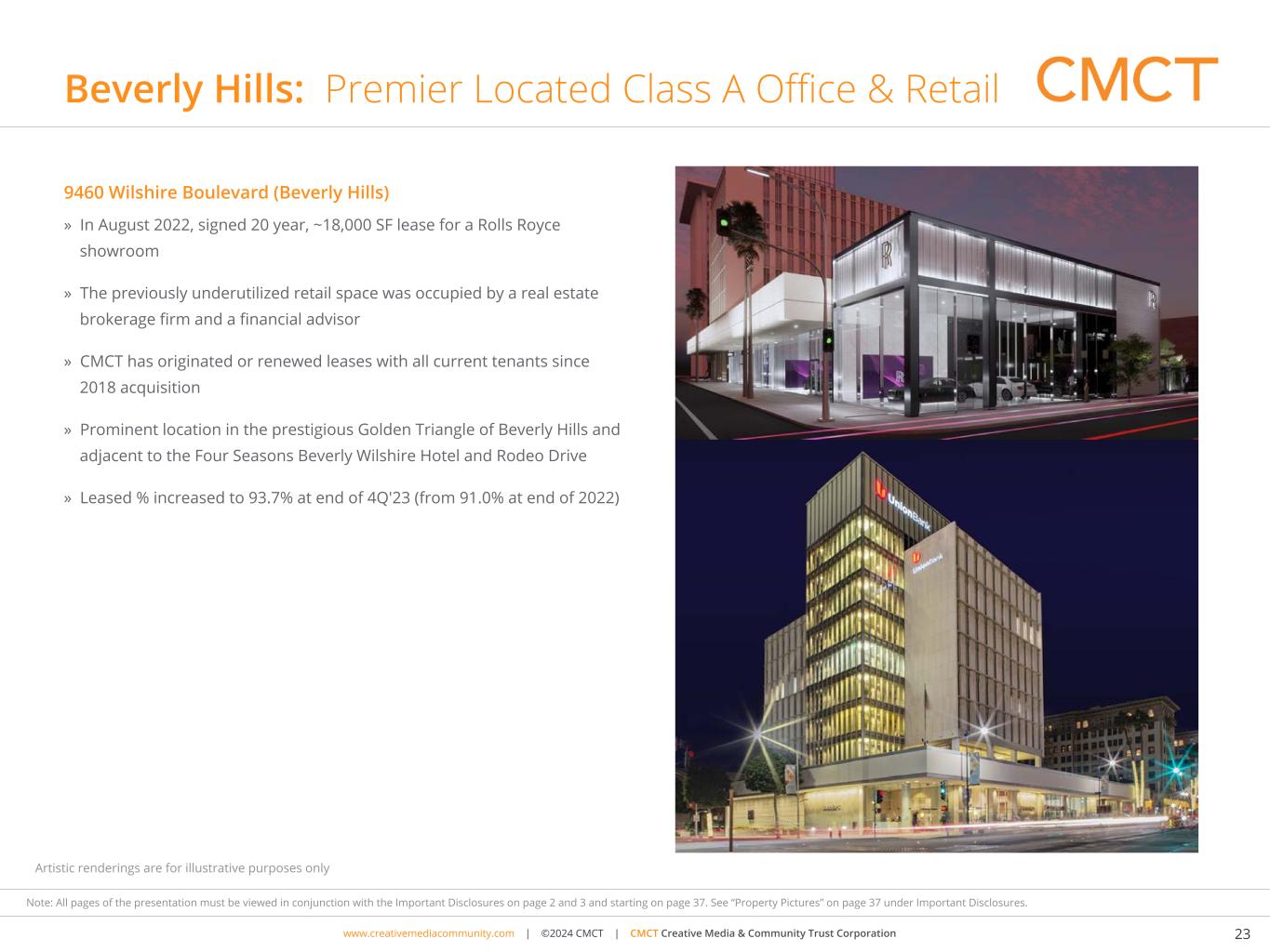 www.cimgroup.com | ©2018 CIM Group | TRADE SECRET / CONFIDENTIAL INFORMATIONwww.creativemediacommunity.com | ©2024 CMCT | CMCT Creative Media & Community Trust Corporation 23 Note: All pages of the presentation must be viewed in conjunction with the Important Disclosures on page 2 and 3 and starting on page 37. See “Property Pictures” on page 37 under Important Disclosures. Beverly Hills: Premier Located Class A Office & Retail 9460 Wilshire Boulevard (Beverly Hills) » In August 2022, signed 20 year, ~18,000 SF lease for a Rolls Royce showroom » The previously underutilized retail space was occupied by a real estate brokerage firm and a financial advisor » CMCT has originated or renewed leases with all current tenants since 2018 acquisition » Prominent location in the prestigious Golden Triangle of Beverly Hills and adjacent to the Four Seasons Beverly Wilshire Hotel and Rodeo Drive » Leased % increased to 93.7% at end of 4Q'23 (from 91.0% at end of 2022) Artistic renderings are for illustrative purposes only