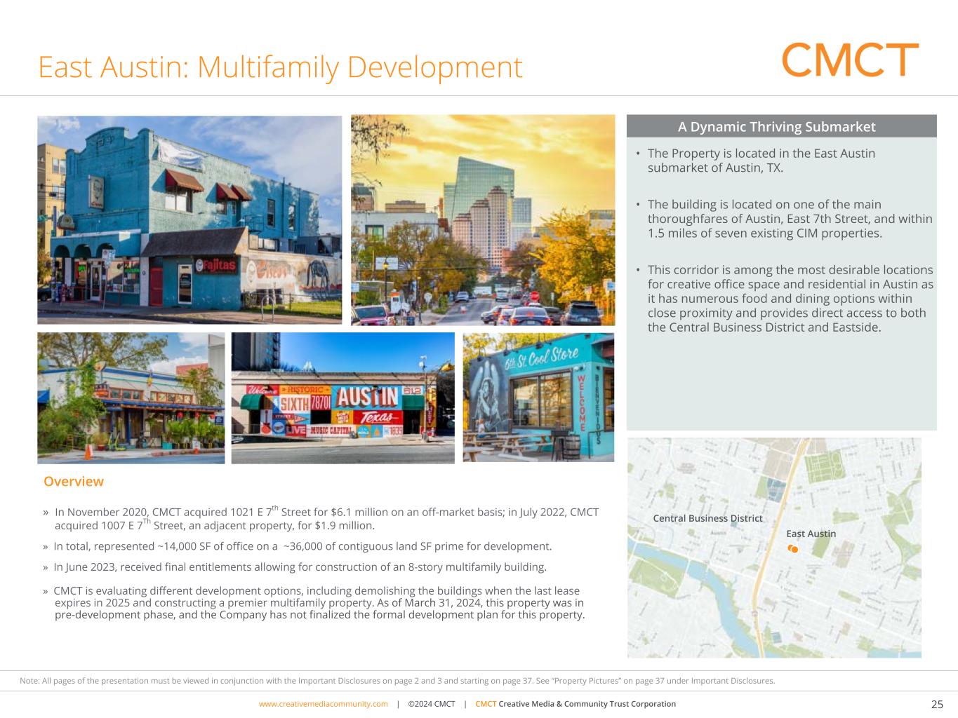 www.cimgroup.com | ©2018 CIM Group | TRADE SECRET / CONFIDENTIAL INFORMATIONwww.creativemediacommunity.com | ©2024 CMCT | CMCT Creative Media & Community Trust Corporation 24 Note: All pages of the presentation must be viewed in conjunction with the Important Disclosures on page 2 and 3 and starting on page 37. See “Property Pictures” on page 37 under Important Disclosures. Austin: Stabilized Creative Office with Potential To Add Multifamily • CMCT acquired the 16-acre campus at 3601 S. Congress Ave in 2007 in an off-market transaction; in-place rents have increased more than threefold since the acquisition. • The creative office campus attracts a diverse tenant mix including technology, media and entertainment companies. • CMCT is evaluating different development options, including adding one or more multifamily buildings to the creative office campus. As of March 31, 2024, this property was in pre-development phase, and the Company has not finalized the formal development plan for this property. • In June 2022, the Austin City Council approved zoning changes that allow CMCT to add more density on this property. • In July 2023, received approval of zone change for the portion of the property that was not previously zoned for multifamily - the entire 16 acre campus is now zoned for multifamily. • No state income tax and diverse employment sources – government, education and tech • Home to many large U.S. corporations including Amazon, Facebook, Apple, Cisco, eBay, GM, Google, IBM, Intel, Oracle, Paypal, 3M and Whole Foods • Rapid market office rent growth (10 year CAGR of 5.6%) 1 • Population growth - Five year forecast growth rate of 2.0% (versus 0.5% in the U.S.) 1 • Employment growth - Ten year historical growth rate of 3.93% (versus 1.22% in the U.S.)1 A Compelling Growth Market Austin Overview Penn Field Penn Field Austin 1) Source Costar July 2021 Office Market Report