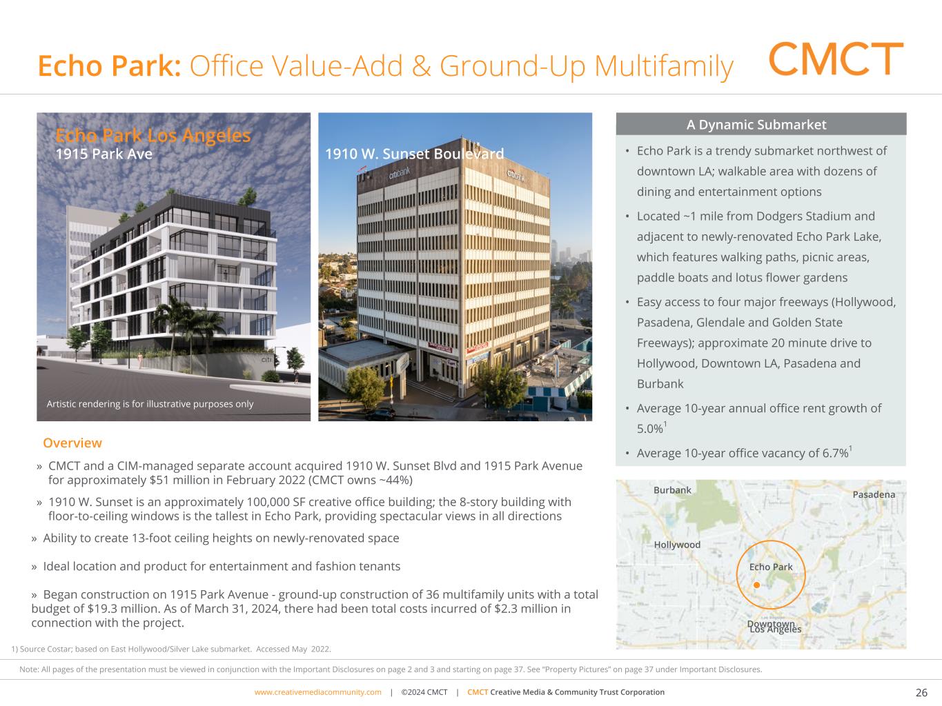 www.cimgroup.com | ©2018 CIM Group | TRADE SECRET / CONFIDENTIAL INFORMATIONwww.creativemediacommunity.com | ©2024 CMCT | CMCT Creative Media & Community Trust Corporation 25 Note: All pages of the presentation must be viewed in conjunction with the Important Disclosures on page 2 and 3 and starting on page 37. See “Property Pictures” on page 37 under Important Disclosures. East Austin: Multifamily Development • The Property is located in the East Austin submarket of Austin, TX. • The building is located on one of the main thoroughfares of Austin, East 7th Street, and within 1.5 miles of seven existing CIM properties. • This corridor is among the most desirable locations for creative office space and residential in Austin as it has numerous food and dining options within close proximity and provides direct access to both the Central Business District and Eastside. A Dynamic Thriving Submarket Overview Central Business District East Austin East Austin, Texas » In November 2020, CMCT acquired 1021 E 7th Street for $6.1 million on an off-market basis; in July 2022, CMCT acquired 1007 E 7Th Street, an adjacent property, for $1.9 million. » In total, represented ~14,000 SF of office on a ~36,000 of contiguous land SF prime for development. » In June 2023, received final entitlements allowing for construction of an 8-story multifamily building. » CMCT is evaluating different development options, including demolishing the buildings when the last lease expires in 2025 and constructing a premier multifamily property. As of March 31, 2024, this property was in pre-development phase, and the Company has not finalized the formal development plan for this property.