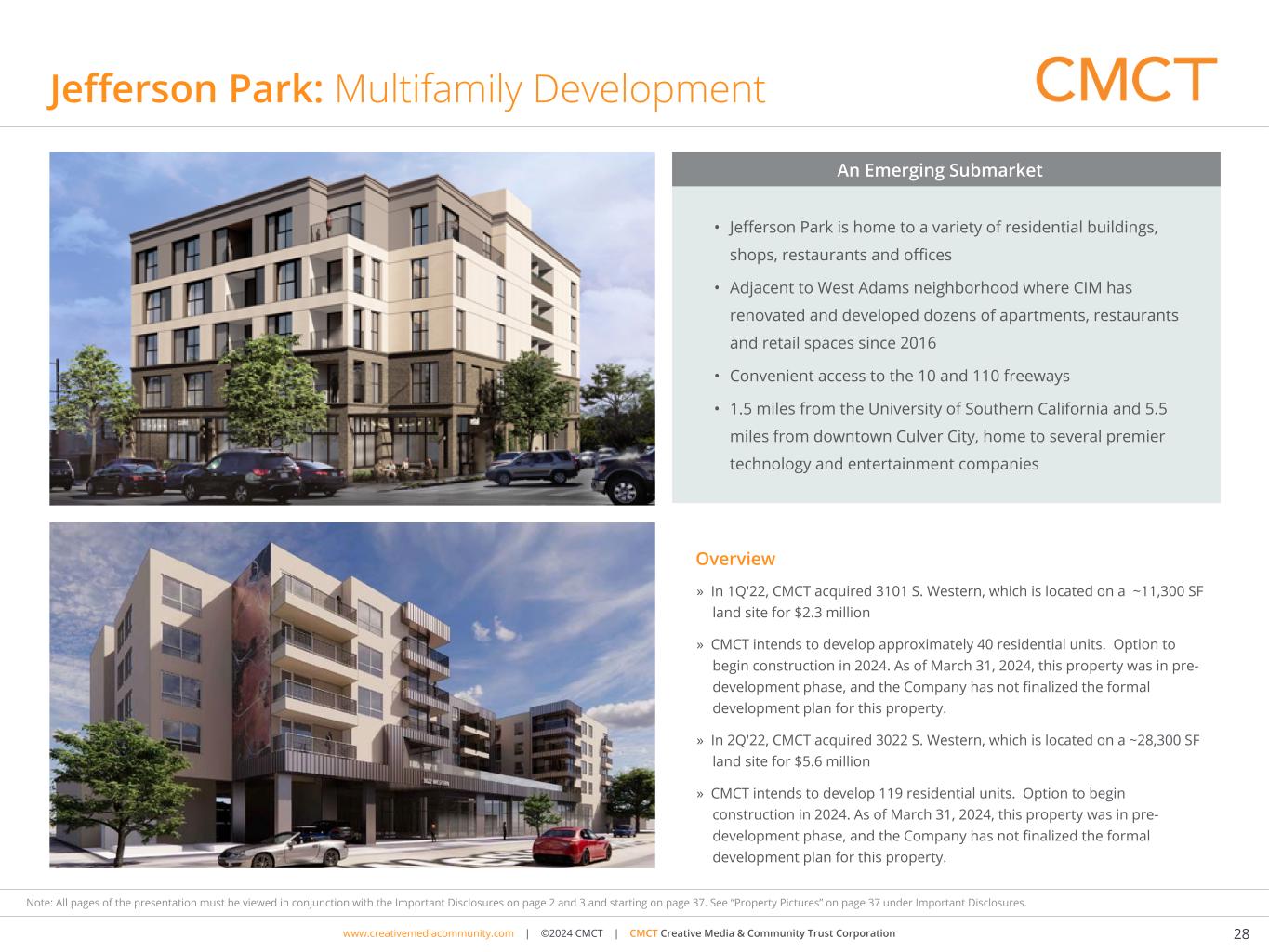 www.cimgroup.com | ©2018 CIM Group | TRADE SECRET / CONFIDENTIAL INFORMATIONwww.creativemediacommunity.com | ©2024 CMCT | CMCT Creative Media & Community Trust Corporation 27 Note: All pages of the presentation must be viewed in conjunction with the Important Disclosures on page 2 and 3 and starting on page 37. See “Property Pictures” on page 37 under Important Disclosures. Culver City: Potential Creative Office Development » 8960 & 8666 Washington Boulevard: ~24,448 SF of creative office space » Received final entitlement to re-develop 8960 & 8666 Washington Blvd. into 50,000 + square foot creative office building. As of March 31, 2024, this property was in pre- development phase, and the Company has not finalized the formal development plan for this property. 8944 Lindblade Street: ~7,980 SF of commercial space currently used for broadcasting. As of March 31, 2024, this property was in pre-development phase, and the Company has not finalized the formal development plan for this property. Culver City Los Angeles Overview • Well-located asset in the heart of Culver City • Home to several high-profile media and technology companies including Apple, Amazon, HBO and Sony • Adjacent to the Metro Expo Line, offering easy access to both the Westside and Downtown LA A Dynamic Thriving Submarket Artistic renderings are for illustrative purposes only Artistic renderings are for illustrative purposes only