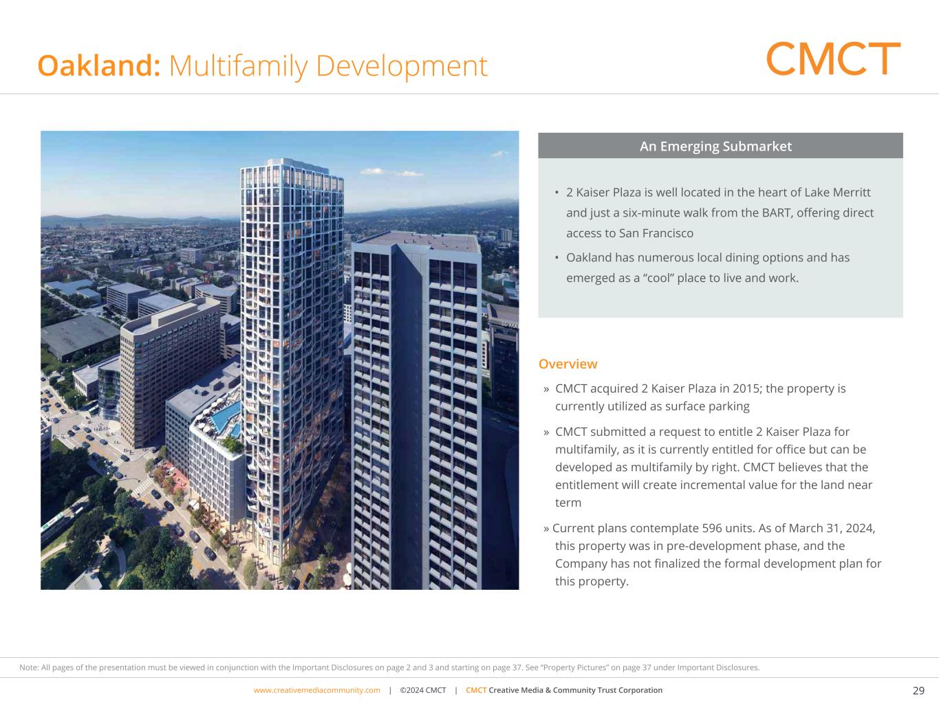 www.cimgroup.com | ©2018 CIM Group | TRADE SECRET / CONFIDENTIAL INFORMATIONwww.creativemediacommunity.com | ©2024 CMCT | CMCT Creative Media & Community Trust Corporation 29 Note: All pages of the presentation must be viewed in conjunction with the Important Disclosures on page 2 and 3 and starting on page 37. See “Property Pictures” on page 37 under Important Disclosures. Oakland: Multifamily Development » CMCT acquired 2 Kaiser Plaza in 2015; the property is currently utilized as surface parking » CMCT submitted a request to entitle 2 Kaiser Plaza for multifamily, as it is currently entitled for office but can be developed as multifamily by right. CMCT believes that the entitlement will create incremental value for the land near term » Current plans contemplate 596 units. As of March 31, 2024, this property was in pre-development phase, and the Company has not finalized the formal development plan for this property. Culver City Los Angeles Overview • 2 Kaiser Plaza is well located in the heart of Lake Merritt and just a six-minute walk from the BART, offering direct access to San Francisco • Oakland has numerous local dining options and has emerged as a “cool” place to live and work. An Emerging Submarket Artistic renderings are for illustrative purposes only