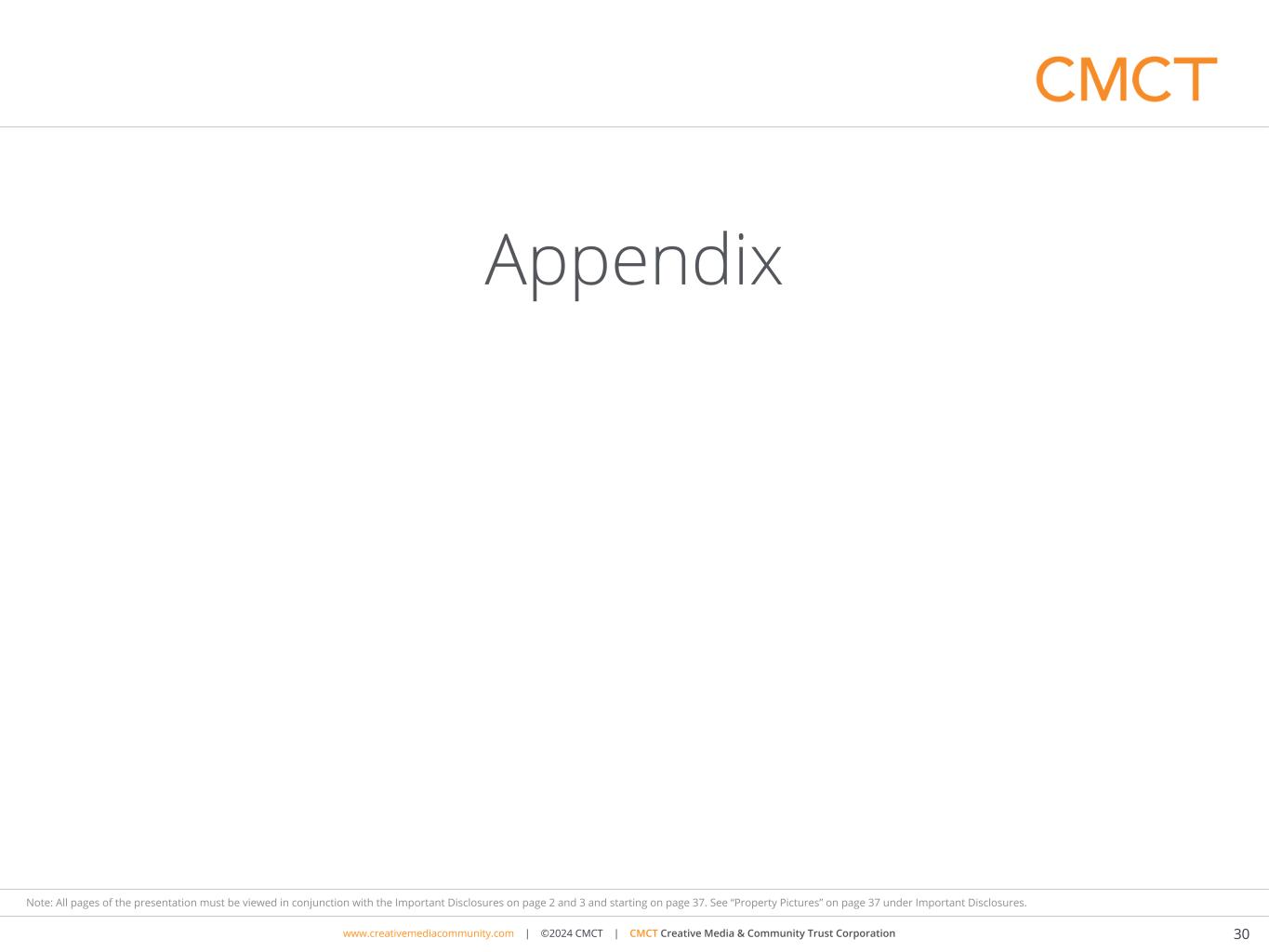 www.cimgroup.com | ©2018 CIM Group | TRADE SECRET / CONFIDENTIAL INFORMATIONwww.creativemediacommunity.com | ©2024 CMCT | CMCT Creative Media & Community Trust Corporation 30 Note: All pages of the presentation must be viewed in conjunction with the Important Disclosures on page 2 and 3 and starting on page 37. See “Property Pictures” on page 37 under Important Disclosures. Appendix