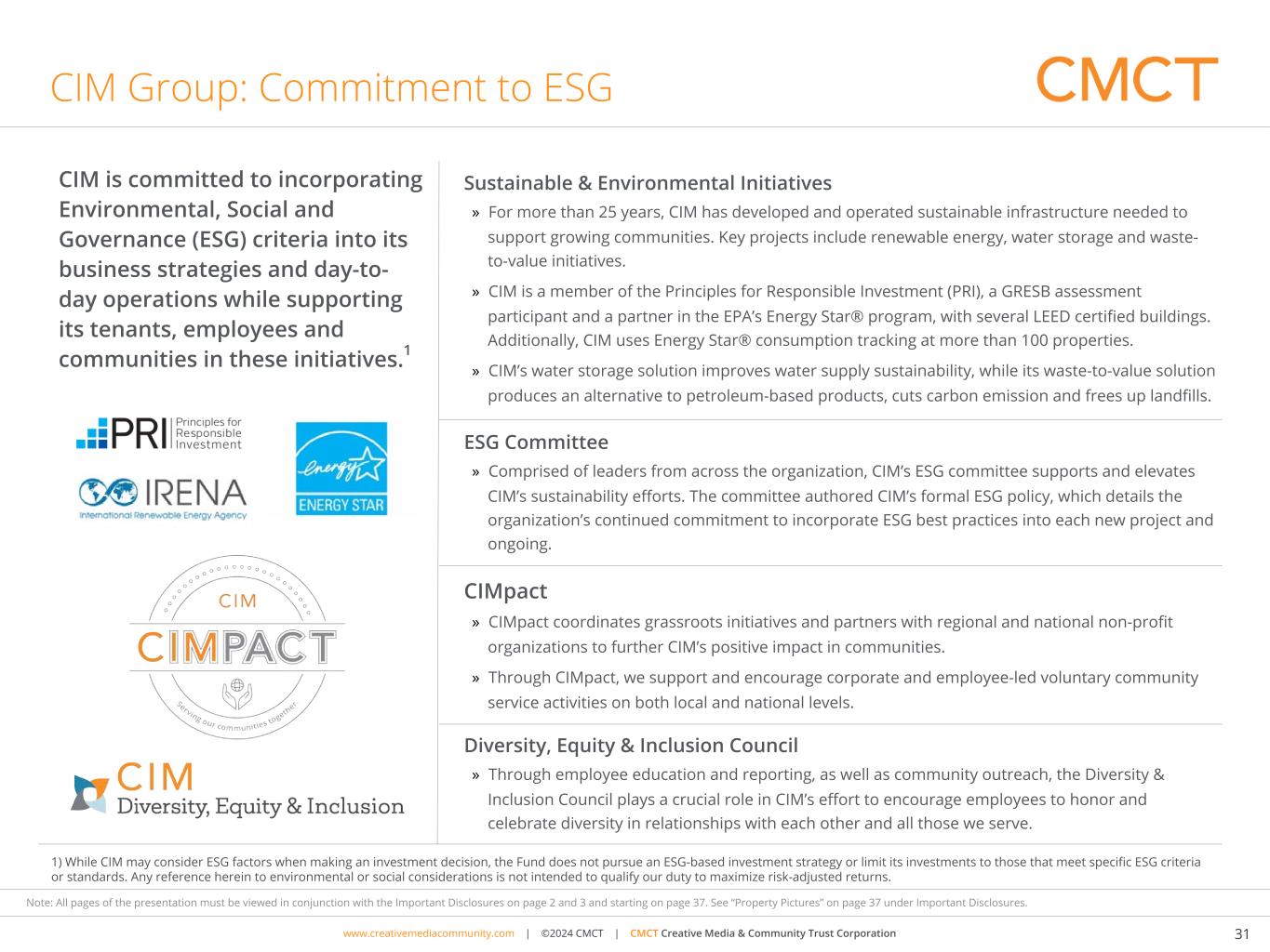 www.cimgroup.com | ©2018 CIM Group | TRADE SECRET / CONFIDENTIAL INFORMATIONwww.creativemediacommunity.com | ©2024 CMCT | CMCT Creative Media & Community Trust Corporation 31 Note: All pages of the presentation must be viewed in conjunction with the Important Disclosures on page 2 and 3 and starting on page 37. See “Property Pictures” on page 37 under Important Disclosures. CIM Group: Commitment to ESG CIM is committed to incorporating Environmental, Social and Governance (ESG) criteria into its business strategies and day-to- day operations while supporting its tenants, employees and communities in these initiatives.1 Sustainable & Environmental Initiatives » For more than 25 years, CIM has developed and operated sustainable infrastructure needed to support growing communities. Key projects include renewable energy, water storage and waste- to-value initiatives. » CIM is a member of the Principles for Responsible Investment (PRI), a GRESB assessment participant and a partner in the EPA’s Energy Star® program, with several LEED certified buildings. Additionally, CIM uses Energy Star® consumption tracking at more than 100 properties. » CIM’s water storage solution improves water supply sustainability, while its waste-to-value solution produces an alternative to petroleum-based products, cuts carbon emission and frees up landfills. ESG Committee » Comprised of leaders from across the organization, CIM’s ESG committee supports and elevates CIM’s sustainability efforts. The committee authored CIM’s formal ESG policy, which details the organization’s continued commitment to incorporate ESG best practices into each new project and ongoing. CIMpact » CIMpact coordinates grassroots initiatives and partners with regional and national non-profit organizations to further CIM’s positive impact in communities. » Through CIMpact, we support and encourage corporate and employee-led voluntary community service activities on both local and national levels. Diversity, Equity & Inclusion Council » Through employee education and reporting, as well as community outreach, the Diversity & Inclusion Council plays a crucial role in CIM’s effort to encourage employees to honor and celebrate diversity in relationships with each other and all those we serve. 1) While CIM may consider ESG factors when making an investment decision, the Fund does not pursue an ESG-based investment strategy or limit its investments to those that meet specific ESG criteria or standards. Any reference herein to environmental or social considerations is not intended to qualify our duty to maximize risk-adjusted returns.