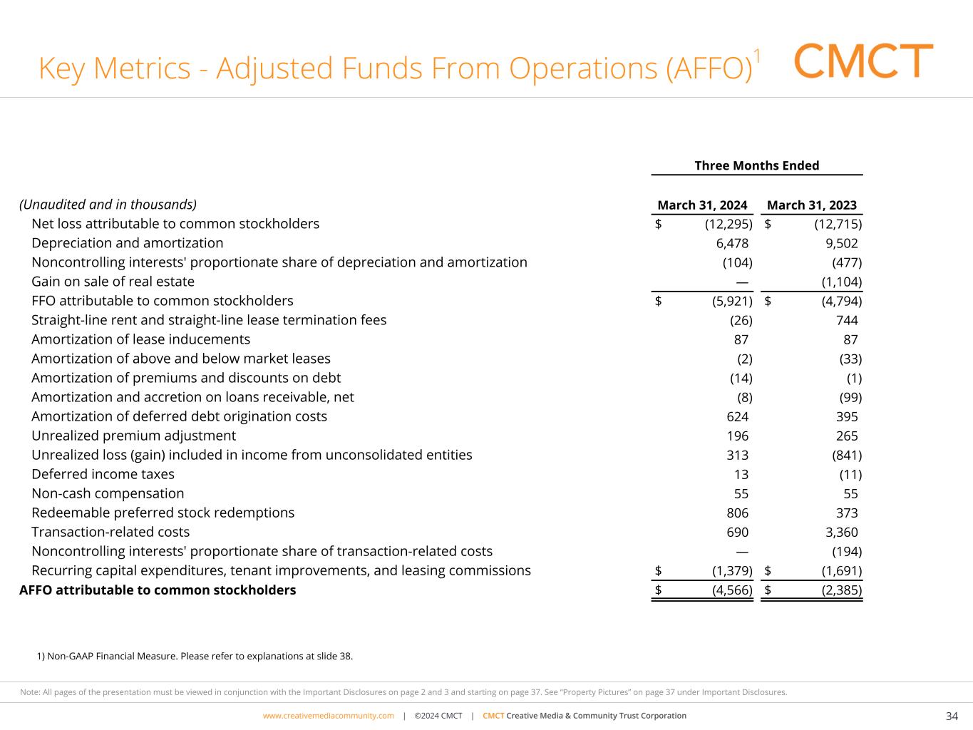 www.cimgroup.com | ©2018 CIM Group | TRADE SECRET / CONFIDENTIAL INFORMATIONwww.creativemediacommunity.com | ©2024 CMCT | CMCT Creative Media & Community Trust Corporation 34 Note: All pages of the presentation must be viewed in conjunction with the Important Disclosures on page 2 and 3 and starting on page 37. See “Property Pictures” on page 37 under Important Disclosures. Key Metrics - Adjusted Funds From Operations (AFFO)1 1) Non-GAAP Financial Measure. Please refer to explanations at slide 38. Three Months Ended (Unaudited and in thousands) March 31, 2024 March 31, 2023 Net loss attributable to common stockholders $ (12,295) $ (12,715) Depreciation and amortization 6,478 9,502 Noncontrolling interests' proportionate share of depreciation and amortization (104) (477) Gain on sale of real estate — (1,104) FFO attributable to common stockholders $ (5,921) $ (4,794) Straight-line rent and straight-line lease termination fees (26) 744 Amortization of lease inducements 87 87 Amortization of above and below market leases (2) (33) Amortization of premiums and discounts on debt (14) (1) Amortization and accretion on loans receivable, net (8) (99) Amortization of deferred debt origination costs 624 395 Unrealized premium adjustment 196 265 Unrealized loss (gain) included in income from unconsolidated entities 313 (841) Deferred income taxes 13 (11) Non-cash compensation 55 55 Redeemable preferred stock redemptions 806 373 Transaction-related costs 690 3,360 Noncontrolling interests' proportionate share of transaction-related costs — (194) Recurring capital expenditures, tenant improvements, and leasing commissions $ (1,379) $ (1,691) AFFO attributable to common stockholders $ (4,566) $ (2,385)