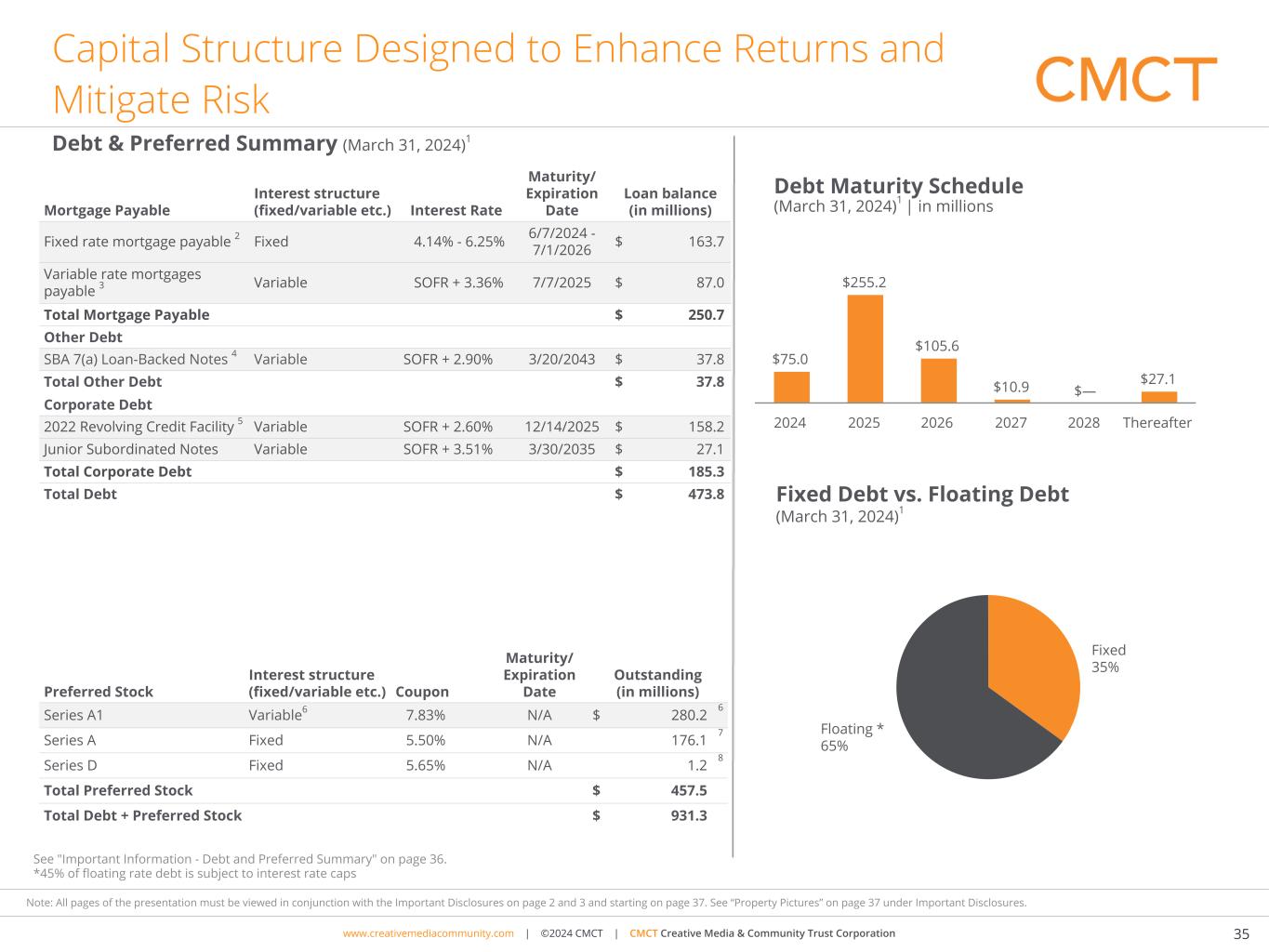 www.cimgroup.com | ©2018 CIM Group | TRADE SECRET / CONFIDENTIAL INFORMATIONwww.creativemediacommunity.com | ©2024 CMCT | CMCT Creative Media & Community Trust Corporation 35 Note: All pages of the presentation must be viewed in conjunction with the Important Disclosures on page 2 and 3 and starting on page 37. See “Property Pictures” on page 37 under Important Disclosures. $75.0 $255.2 $105.6 $10.9 $— $27.1 2024 2025 2026 2027 2028 Thereafter Debt & Preferred Summary (March 31, 2024)1 Fixed 35% Floating * 65% Debt Maturity Schedule (March 31, 2024)1 | in millions Fixed Debt vs. Floating Debt (March 31, 2024)1 Mortgage Payable Interest structure (fixed/variable etc.) Interest Rate Maturity/ Expiration Date Loan balance (in millions) Fixed rate mortgage payable 2 Fixed 4.14% - 6.25% 6/7/2024 - 7/1/2026 $ 163.7 Variable rate mortgages payable 3 Variable SOFR + 3.36% 7/7/2025 $ 87.0 Total Mortgage Payable $ 250.7 Other Debt SBA 7(a) Loan-Backed Notes 4 Variable SOFR + 2.90% 3/20/2043 $ 37.8 Total Other Debt $ 37.8 Corporate Debt 2022 Revolving Credit Facility 5 Variable SOFR + 2.60% 12/14/2025 $ 158.2 Junior Subordinated Notes Variable SOFR + 3.51% 3/30/2035 $ 27.1 Total Corporate Debt $ 185.3 Total Debt $ 473.8 Preferred Stock Interest structure (fixed/variable etc.) Coupon Maturity/ Expiration Date Outstanding (in millions) Series A1 Variable6 7.83% N/A $ 280.2 6 Series A Fixed 5.50% N/A 176.1 7 Series D Fixed 5.65% N/A 1.2 8 Total Preferred Stock $ 457.5 Total Debt + Preferred Stock $ 931.3 Capital Structure Designed to Enhance Returns and Mitigate Risk See "Important Information - Debt and Preferred Summary" on page 36. *45% of floating rate debt is subject to interest rate caps