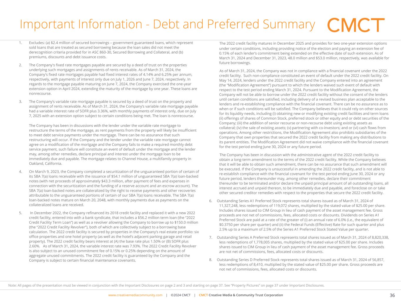 www.cimgroup.com | ©2018 CIM Group | TRADE SECRET / CONFIDENTIAL INFORMATIONwww.creativemediacommunity.com | ©2024 CMCT | CMCT Creative Media & Community Trust Corporation 36 Note: All pages of the presentation must be viewed in conjunction with the Important Disclosures on page 2 and 3 and starting on page 37. See “Property Pictures” on page 37 under Important Disclosures. Important Information - Debt and Preferred Summary 1. Excludes: (a) $2.4 million of secured borrowings – government guaranteed loans, which represent sold loans that are treated as secured borrowing because the loan sales did not meet the derecognition criteria provided for in ASC 860-30, Secured Borrowing and Collateral, and (b) premiums, discounts and debt issuance costs. 2. The Company's fixed rate mortgages payable are secured by a deed of trust on the properties underlying such mortgages and assignments of rents receivable. As of March 31, 2024, the Company's fixed rate mortgages payable had fixed interest rates of 4.14% and 6.25% per annum, respectively, with payments of interest only due on July 1, 2026 and June 7, 2024, respectively. In regards to the mortgage payable maturing on June 7, 2024, the Company exercised the one-year extension option in April 2024, extending the maturity of the mortgage by one year. These loans are nonrecourse. 3. The Company’s variable rate mortgage payable is secured by a deed of trust on the property and assignment of rents receivable. As of March 31, 2024, the Company’s variable rate mortgage payable had a variable interest rate of SOFR plus 3.36%, with monthly payments of interest only, due on July 7, 2025 with an extension option subject to certain conditions being met. The loan is nonrecourse. The Company has been in discussions with the lender under the variable rate mortgage to restructure the terms of the mortgage, as rent payments from the property will likely be insufficient to meet debt service payments under the mortgage. There can be no assurance that such restructuring will occur. If the Company and the lender under the variable rate mortgage cannot agree on a modification of the mortgage and the Company fails to make a required monthly debt service payment, such failure will constitute an event of default under the mortgage and the lender may, among other remedies, declare principal and interest under the mortgage loan to be immediately due and payable. The mortgage relates to Channel House, a multifamily property in Oakland, California. 4. On March 9, 2023, the Company completed a securitization of the unguaranteed portion of certain of its SBA 7(a) loans receivable with the issuance of $54.1 million of unguaranteed SBA 7(a) loan-backed notes (with net proceeds of approximately $43.3 million, after payment of fees and expenses in connection with the securitization and the funding of a reserve account and an escrow account). The SBA 7(a) loan-backed notes are collateralized by the right to receive payments and other recoveries attributable to the unguaranteed portions of certain of our SBA 7(a) loans receivable. The SBA 7(a) loan-backed notes mature on March 20, 2048, with monthly payments due as payments on the collateralized loans are received. 5. In December 2022, the Company refinanced its 2018 credit facility and replaced it with a new 2022 credit facility, entered into with a bank syndicate, that includes a $56.2 million term loan (the “2022 Credit Facility Term Loan”) as well as a revolver allowing the Company to borrow up to $150.0 million (the “2022 Credit Facility Revolver”), both of which are collectively subject to a borrowing base calculation. The 2022 credit facility is secured by properties in the Company’s real estate portfolio: six office properties and one hotel property (as well as the hotel’s adjacent parking garage and retail property). The 2022 credit facility bears interest at (A) the base rate plus 1.50% or (B) SOFR plus 2.60%. As of March 31, 2024, the variable interest rate was 7.93%. The 2022 Credit Facility Revolver is also subject to an unused commitment fee of 0.15% or 0.25% depending on the amount of aggregate unused commitments. The 2022 credit facility is guaranteed by the Company and the Company is subject to certain financial maintenance covenants. The 2022 credit facility matures in December 2025 and provides for two one-year extension options under certain conditions, including providing notice of the election and paying an extension fee of 0.15% of each lender’s commitment being extended on the effective date of such extension. As of March 31, 2024 and December 31, 2023, 48.0 million and $53.0 million, respectively, was available for future borrowings. As of March 31, 2024, the Company was not in compliance with a financial covenant under the 2022 credit facility. Such non-compliance constituted an event of default under the 2022 credit facility. On May 14, 2024, lenders under the 2022 credit facility and the Company entered into an agreement (the “Modification Agreement”) pursuant to which the lenders waived such event of default with respect to the test period ending March 31, 2024. Pursuant to the Modification Agreement, the Company will not be able to borrow under the 2022 credit facility without the consent of the lenders until certain conditions are satisfied, including delivery of a revised business plan acceptable to the lenders and re-establishing compliance with the financial covenant. There can be no assurance as to when or if such conditions will be satisfied. The Company believes that it could rely on other sources for its liquidity needs, including (i) obtaining new or modifying existing credit facilities and term loans (ii) offerings of shares of Common Stock, preferred stock or other equity and or debt securities of the Company; (iii) the addition of senior recourse or non-recourse debt using existing assets as collateral; (iv) the sale of existing assets; (v) partnering with co-inve
