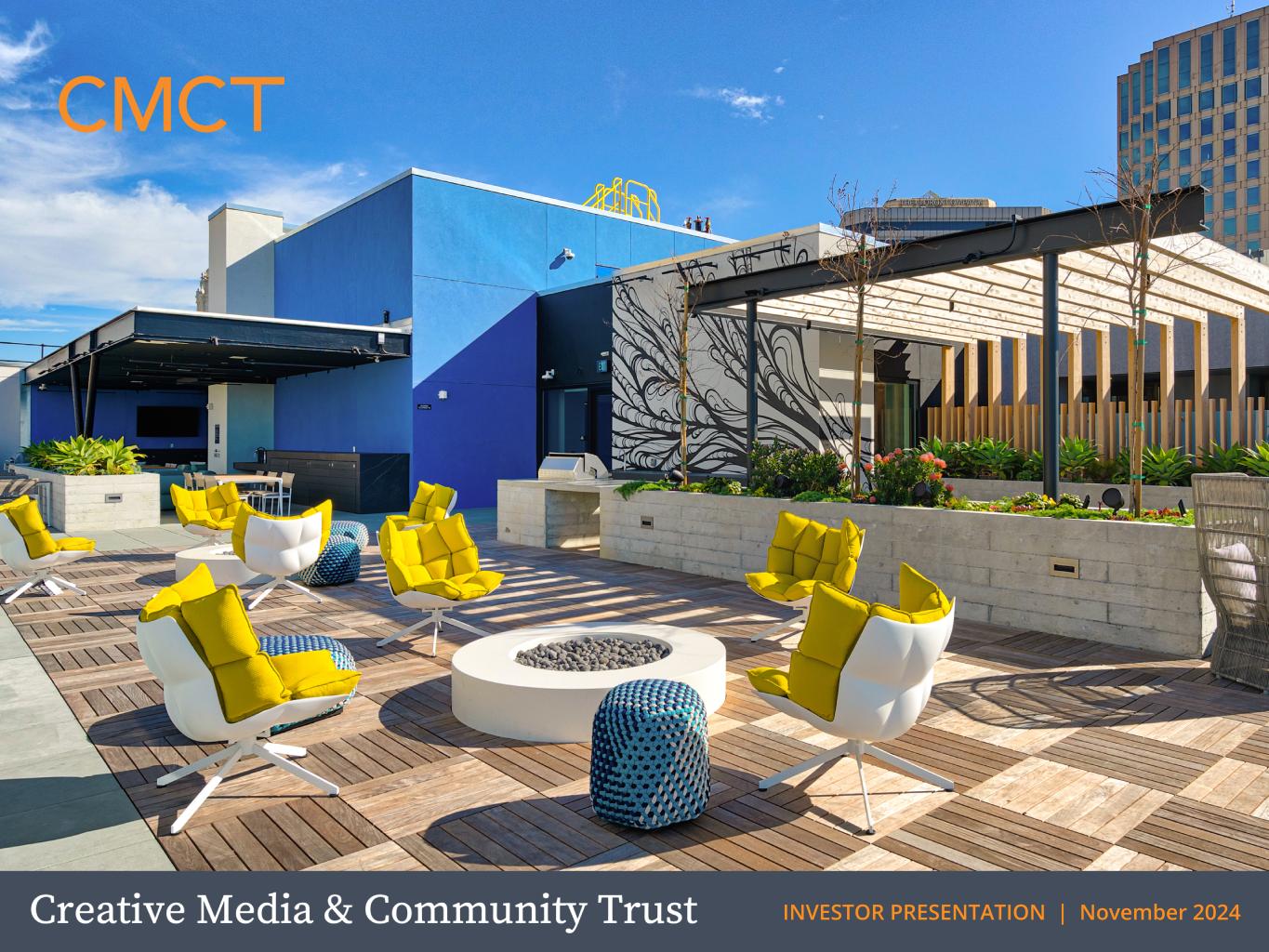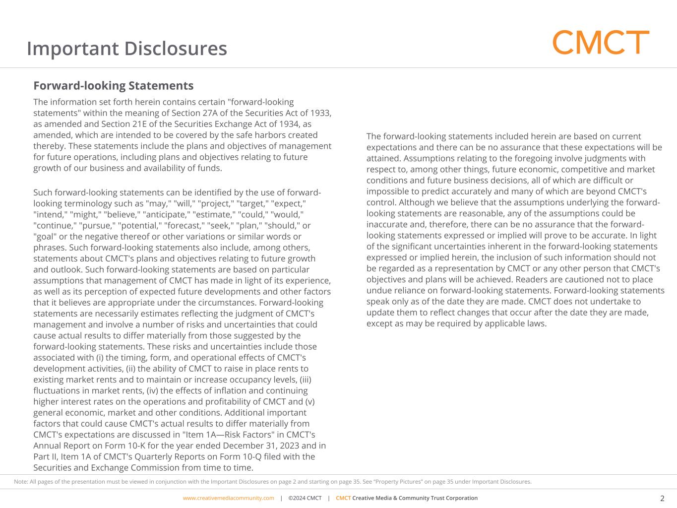www.cimgroup.com | ©2018 CIM Group | TRADE SECRET / CONFIDENTIAL INFORMATIONwww.creativemediacommunity.com | ©2024 CMCT | CMCT Creative Media & Community Trust Corporation 2 Note: All pages of the presentation must be viewed in conjunction with the Important Disclosures on page 2 and starting on page 35. See “Property Pictures” on page 35 under Important Disclosures. Important Disclosures Forward-looking Statements The information set forth herein contains certain "forward-looking statements" within the meaning of Section 27A of the Securities Act of 1933, as amended and Section 21E of the Securities Exchange Act of 1934, as amended, which are intended to be covered by the safe harbors created thereby. These statements include the plans and objectives of management for future operations, including plans and objectives relating to future growth of our business and availability of funds. Such forward-looking statements can be identified by the use of forward- looking terminology such as "may," "will," "project," "target," "expect," "intend," "might," "believe," "anticipate," "estimate," "could," "would," "continue," "pursue," "potential," "forecast," "seek," "plan," "should," or "goal" or the negative thereof or other variations or similar words or phrases. Such forward-looking statements also include, among others, statements about CMCT's plans and objectives relating to future growth and outlook. Such forward-looking statements are based on particular assumptions that management of CMCT has made in light of its experience, as well as its perception of expected future developments and other factors that it believes are appropriate under the circumstances. Forward-looking statements are necessarily estimates reflecting the judgment of CMCT's management and involve a number of risks and uncertainties that could cause actual results to differ materially from those suggested by the forward-looking statements. These risks and uncertainties include those associated with (i) the timing, form, and operational effects of CMCT's development activities, (ii) the ability of CMCT to raise in place rents to existing market rents and to maintain or increase occupancy levels, (iii) fluctuations in market rents, (iv) the effects of inflation and continuing higher interest rates on the operations and profitability of CMCT and (v) general economic, market and other conditions. Additional important factors that could cause CMCT's actual results to differ materially from CMCT's expectations are discussed in "Item 1A—Risk Factors" in CMCT's Annual Report on Form 10-K for the year ended December 31, 2023 and in Part II, Item 1A of CMCT's Quarterly Reports on Form 10-Q filed with the Securities and Exchange Commission from time to time. The forward-looking statements included herein are based on current expectations and there can be no assurance that these expectations will be attained. Assumptions relating to the foregoing involve judgments with respect to, among other things, future economic, competitive and market conditions and future business decisions, all of which are difficult or impossible to predict accurately and many of which are beyond CMCT's control. Although we believe that the assumptions underlying the forward- looking statements are reasonable, any of the assumptions could be inaccurate and, therefore, there can be no assurance that the forward- looking statements expressed or implied will prove to be accurate. In light of the significant uncertainties inherent in the forward-looking statements expressed or implied herein, the inclusion of such information should not be regarded as a representation by CMCT or any other person that CMCT's objectives and plans will be achieved. Readers are cautioned not to place undue reliance on forward-looking statements. Forward-looking statements speak only as of the date they are made. CMCT does not undertake to update them to reflect changes that occur after the date they are made, except as may be required by applicable laws.
