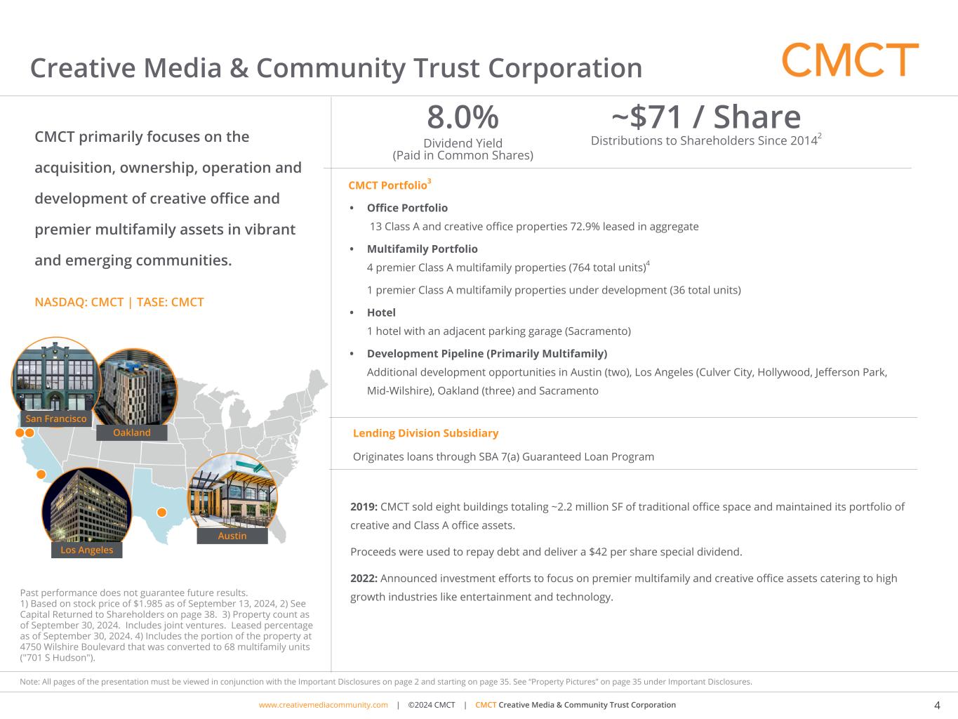 www.cimgroup.com | ©2018 CIM Group | TRADE SECRET / CONFIDENTIAL INFORMATIONwww.creativemediacommunity.com | ©2024 CMCT | CMCT Creative Media & Community Trust Corporation 3 Note: All pages of the presentation must be viewed in conjunction with the Important Disclosures on page 2 and starting on page 35. See “Property Pictures” on page 35 under Important Disclosures. CIM Group: Manager of CMCT CIM data as of June 30, 2024 (Assets Owned and Operated is unaudited). See disclosure statement under “Assets Owned and Operated” and “Property Pictures” on page 35. 1) Includes affiliates of CIM and officers and directors of CMCT. As of September 30, 2024. CIM Group Management, LLC (“CIM”) is a community- focused real estate and infrastructure owner, operator, lender and developer. The Independent | Austin 491,000 SF | For Sale Residential, Ground Floor Retail, Parking Key CIM Group Projects Santa Monica Westgate | Los Angeles 143,000 SF Residential, Ground Floor Retail Sunset La Cienega | Los Angeles 384,500 SF | Hotel, For Sale Residential, Ground Floor Retail Seaholm | Austin 551,000 SF | For Sale Residential, Ground Floor Retail, Parking 432 Park Avenue | New York City 518,250 SF | For Sale Residential, Ground Floor Retail 11 Madison | New York City 2.2M SF | Class A Office, Ground Floor Retail, Storage 1994 Established 385 Real Assets Owned and Operated $27.8B Assets Owned and Operated 1,000+ Employees 10 Corporate Offices Worldwide CIM Group owns ~15.1% of CMCT 1 Competitive Advantages Diverse Team of In-house Professionals Commitment to Community Disciplined Approach