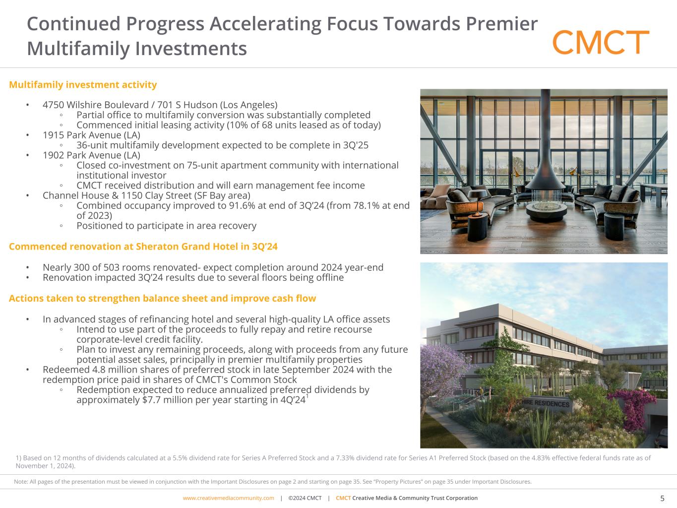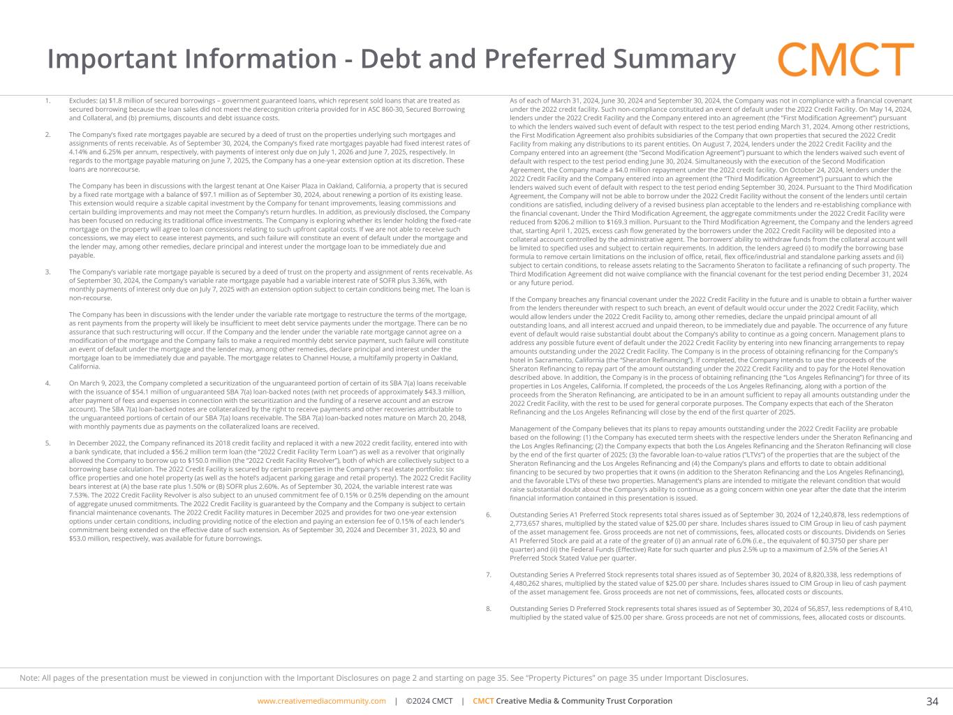 www.cimgroup.com | ©2018 CIM Group | TRADE SECRET / CONFIDENTIAL INFORMATIONwww.creativemediacommunity.com | ©2024 CMCT | CMCT Creative Media & Community Trust Corporation 34 Note: All pages of the presentation must be viewed in conjunction with the Important Disclosures on page 2 and starting on page 35. See “Property Pictures” on page 35 under Important Disclosures. Important Information - Debt and Preferred Summary As of each of March 31, 2024, June 30, 2024 and September 30, 2024, the Company was not in compliance with a financial covenant under the 2022 credit facility. Such non-compliance constituted an event of default under the 2022 Credit Facility. On May 14, 2024, lenders under the 2022 Credit Facility and the Company entered into an agreement (the “First Modification Agreement”) pursuant to which the lenders waived such event of default with respect to the test period ending March 31, 2024. Among other restrictions, the First Modification Agreement also prohibits subsidiaries of the Company that own properties that secured the 2022 Credit Facility from making any distributions to its parent entities. On August 7, 2024, lenders under the 2022 Credit Facility and the Company entered into an agreement (the “Second Modification Agreement”) pursuant to which the lenders waived such event of default with respect to the test period ending June 30, 2024. Simultaneously with the execution of the Second Modification Agreement, the Company made a $4.0 million repayment under the 2022 credit facility. On October 24, 2024, lenders under the 2022 Credit Facility and the Company entered into an agreement (the “Third Modification Agreement”) pursuant to which the lenders waived such event of default with respect to the test period ending September 30, 2024. Pursuant to the Third Modification Agreement, the Company will not be able to borrow under the 2022 Credit Facility without the consent of the lenders until certain conditions are satisfied, including delivery of a revised business plan acceptable to the lenders and re-establishing compliance with the financial covenant. Under the Third Modification Agreement, the aggregate commitments under the 2022 Credit Facility were reduced from $206.2 million to $169.3 million. Pursuant to the Third Modification Agreement, the Company and the lenders agreed that, starting April 1, 2025, excess cash flow generated by the borrowers under the 2022 Credit Facility will be deposited into a collateral account controlled by the administrative agent. The borrowers’ ability to withdraw funds from the collateral account will be limited to specified uses and subject to certain requirements. In addition, the lenders agreed (i) to modify the borrowing base formula to remove certain limitations on the inclusion of office, retail, flex office/industrial and standalone parking assets and (ii) subject to certain conditions, to release assets relating to the Sacramento Sheraton to facilitate a refinancing of such property. The Third Modification Agreement did not waive compliance with the financial covenant for the test period ending December 31, 2024 or any future period. If the Company breaches any financial covenant under the 2022 Credit Facility in the future and is unable to obtain a further waiver from the lenders thereunder with respect to such breach, an event of default would occur under the 2022 Credit Facility, which would allow lenders under the 2022 Credit Facility to, among other remedies, declare the unpaid principal amount of all outstanding loans, and all interest accrued and unpaid thereon, to be immediately due and payable. The occurrence of any future event of default would raise substantial doubt about the Company’s ability to continue as a going concern. Management plans to address any possible future event of default under the 2022 Credit Facility by entering into new financing arrangements to repay amounts outstanding under the 2022 Credit Facility. The Company is in the process of obtaining refinancing for the Company’s hotel in Sacramento, California (the “Sheraton Refinancing”). If completed, the Company intends to use the proceeds of the Sheraton Refinancing to repay part of the amount outstanding under the 2022 Credit Facility and to pay for the Hotel Renovation described above. In addition, the Company is in the process of obtaining refinancing (the “Los Angeles Refinancing”) for three of its properties in Los Angeles, California. If completed, the proceeds of the Los Angeles Refinancing, along with a portion of the proceeds from the Sheraton Refinancing, are anticipated to be in an amount sufficient to repay all amounts outstanding under the 2022 Credit Facility, with the rest to be used for general corporate purposes. The Company expects that each of the Sheraton Refinancing and the Los Angeles Refinancing will close by the end of the first quarter of 2025. Management of the Company believes that its plans to repay amounts outstanding under the 2022 Credit Facility are probable based on the following: (1) the Company has executed term sheets with the respective lenders under the Sheraton Refinancing and the Los Angles Refinancing; (2) the Company expects that both the Los Angeles Refinancing and the Sheraton Refinancing will close by the end of the first quarter of 2025; (3) the favorable loan-to-value ratios (“LTVs”) of the properties that are the subject of the Sheraton Refinancing and the Los Angeles Refinancing and (4) the Company’s plans and efforts to date to obtain additional financing to be secured by two properties that it owns (in addition to the Sheraton Refinancing and the Los Angeles Refinancing), and the favorable LTVs of these two properties. Management’s plans are intended to mitigate the relevant condition that would raise substantial doubt about the Company’s ability to continue as a going concern within one year after the date that the interim financial information contained i