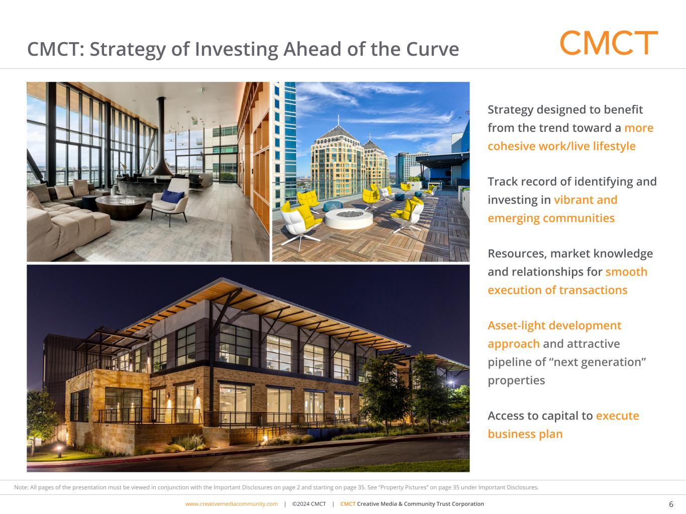 www.cimgroup.com | ©2018 CIM Group | TRADE SECRET / CONFIDENTIAL INFORMATIONwww.creativemediacommunity.com | ©2024 CMCT | CMCT Creative Media & Community Trust Corporation 5 Note: All pages of the presentation must be viewed in conjunction with the Important Disclosures on page 2 and starting on page 35. See “Property Pictures” on page 35 under Important Disclosures. Multifamily investment activity • 4750 Wilshire Boulevard / 701 S Hudson (Los Angeles) ◦ Partial office to multifamily conversion was substantially completed ◦ Commenced initial leasing activity (10% of 68 units leased as of today) • 1915 Park Avenue (LA) ◦ 36-unit multifamily development expected to be complete in 3Q'25 • 1902 Park Avenue (LA) ◦ Closed co-investment on 75-unit apartment community with international institutional investor ◦ CMCT received distribution and will earn management fee income • Channel House & 1150 Clay Street (SF Bay area) ◦ Combined occupancy improved to 91.6% at end of 3Q’24 (from 78.1% at end of 2023) ◦ Positioned to participate in area recovery Commenced renovation at Sheraton Grand Hotel in 3Q’24 • Nearly 300 of 503 rooms renovated- expect completion around 2024 year-end • Renovation impacted 3Q’24 results due to several floors being offline Actions taken to strengthen balance sheet and improve cash flow • In advanced stages of refinancing hotel and several high-quality LA office assets ◦ Intend to use part of the proceeds to fully repay and retire recourse corporate-level credit facility. ◦ Plan to invest any remaining proceeds, along with proceeds from any future potential asset sales, principally in premier multifamily properties • Redeemed 4.8 million shares of preferred stock in late September 2024 with the redemption price paid in shares of CMCT's Common Stock ◦ Redemption expected to reduce annualized preferred dividends by approximately $7.7 million per year starting in 4Q’241 Continued Progress Accelerating Focus Towards Premier Multifamily Investments 9460 Wilshire | Rolls Royce lease signed in 2022 Artistic Renderings 1) Based on 12 months of dividends calculated at a 5.5% dividend rate for Series A Preferred Stock and a 7.33% dividend rate for Series A1 Preferred Stock (based on the 4.83% effective federal funds rate as of November 1, 2024).