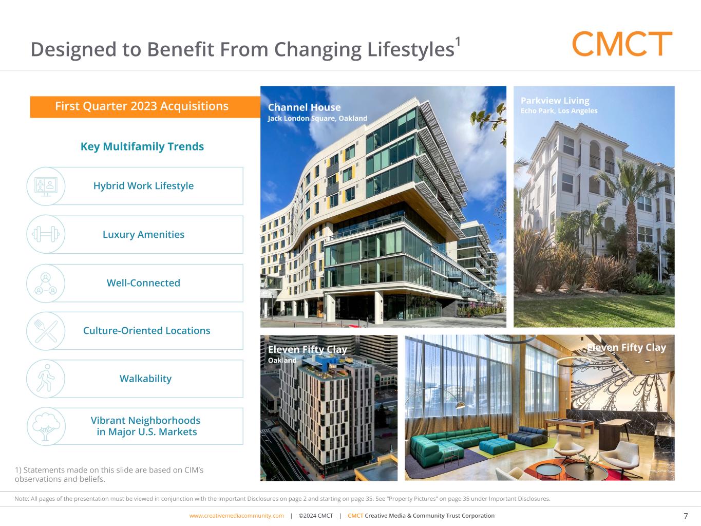 www.cimgroup.com | ©2018 CIM Group | TRADE SECRET / CONFIDENTIAL INFORMATIONwww.creativemediacommunity.com | ©2024 CMCT | CMCT Creative Media & Community Trust Corporation 6 Note: All pages of the presentation must be viewed in conjunction with the Important Disclosures on page 2 and starting on page 35. See “Property Pictures” on page 35 under Important Disclosures. Strategy designed to benefit from the trend toward a more cohesive work/live lifestyle Track record of identifying and investing in vibrant and emerging communities Resources, market knowledge and relationships for smooth execution of transactions Asset-light development approach and attractive pipeline of “next generation” properties Access to capital to execute business plan CMCT: Strategy of Investing Ahead of the Curve
