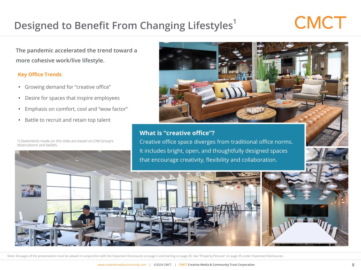 www.cimgroup.com | ©2018 CIM Group | TRADE SECRET / CONFIDENTIAL INFORMATIONwww.creativemediacommunity.com | ©2024 CMCT | CMCT Creative Media & Community Trust Corporation 7 Note: All pages of the presentation must be viewed in conjunction with the Important Disclosures on page 2 and starting on page 35. See “Property Pictures” on page 35 under Important Disclosures. Designed to Benefit From Changing Lifestyles1 Key Multifamily Trends Walkability Luxury Amenities Well-Connected Hybrid Work Lifestyle Culture-Oriented Locations Vibrant Neighborhoods in Major U.S. Markets 1) Statements made on this slide are based on CIM’s observations and beliefs. First Quarter 2023 Acquisitions Channel House Jack London Square, Oakland Parkview Living Echo Park, Los Angeles Eleven Fifty Clay Oakland Eleven Fifty Clay
