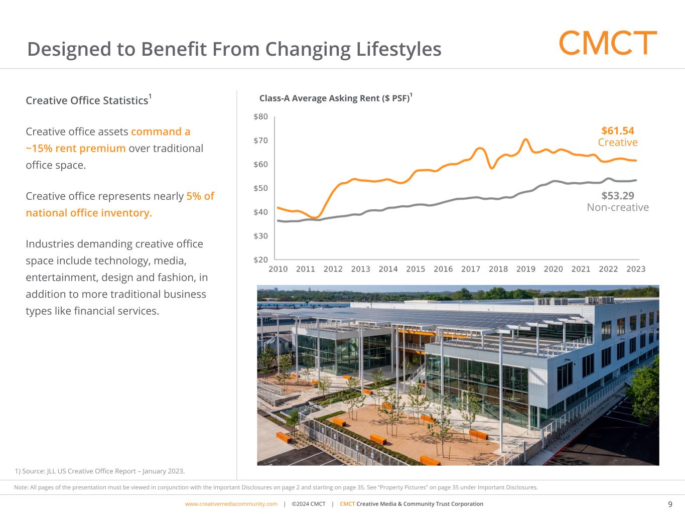 www.cimgroup.com | ©2018 CIM Group | TRADE SECRET / CONFIDENTIAL INFORMATIONwww.creativemediacommunity.com | ©2024 CMCT | CMCT Creative Media & Community Trust Corporation 8 Note: All pages of the presentation must be viewed in conjunction with the Important Disclosures on page 2 and starting on page 35. See “Property Pictures” on page 35 under Important Disclosures. Designed to Benefit From Changing Lifestyles1 The pandemic accelerated the trend toward a more cohesive work/live lifestyle. 1) Statements made on this slide are based on CIM Group’s observations and beliefs. Key Office Trends • Growing demand for “creative office” • Desire for spaces that inspire employees • Emphasis on comfort, cool and “wow factor” • Battle to recruit and retain top talent What is “creative office”? Creative office space diverges from traditional office norms. It includes bright, open, and thoughtfully designed spaces that encourage creativity, flexibility and collaboration.