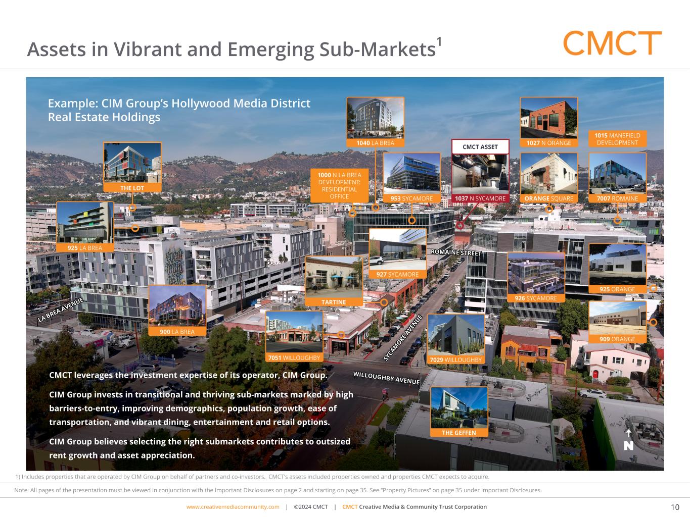 www.cimgroup.com | ©2018 CIM Group | TRADE SECRET / CONFIDENTIAL INFORMATIONwww.creativemediacommunity.com | ©2024 CMCT | CMCT Creative Media & Community Trust Corporation 9 Note: All pages of the presentation must be viewed in conjunction with the Important Disclosures on page 2 and starting on page 35. See “Property Pictures” on page 35 under Important Disclosures. Designed to Benefit From Changing Lifestyles Creative Office Statistics1 Creative office assets command a ~15% rent premium over traditional office space. Creative office represents nearly 5% of national office inventory. Industries demanding creative office space include technology, media, entertainment, design and fashion, in addition to more traditional business types like financial services. 1) Source: JLL US Creative Office Report – January 2023. Class-A Average Asking Rent ($ PSF)1 $61.54 Creative $53.29 Non-creative