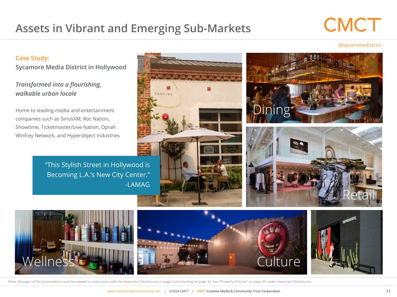 www.cimgroup.com | ©2018 CIM Group | TRADE SECRET / CONFIDENTIAL INFORMATIONwww.creativemediacommunity.com | ©2024 CMCT | CMCT Creative Media & Community Trust Corporation 10 Note: All pages of the presentation must be viewed in conjunction with the Important Disclosures on page 2 and starting on page 35. See “Property Pictures” on page 35 under Important Disclosures. Assets in Vibrant and Emerging Sub-Markets1 CMCT leverages the investment expertise of its operator, CIM Group. CIM Group invests in transitional and thriving sub-markets marked by high barriers-to-entry, improving demographics, population growth, ease of transportation, and vibrant dining, entertainment and retail options. CIM Group believes selecting the right submarkets contributes to outsized rent growth and asset appreciation. Example: CIM Group’s Hollywood Media District Real Estate Holdings 1) Includes properties that are operated by CIM Group on behalf of partners and co-investors. CMCT’s assets included properties owned and properties CMCT expects to acquire.